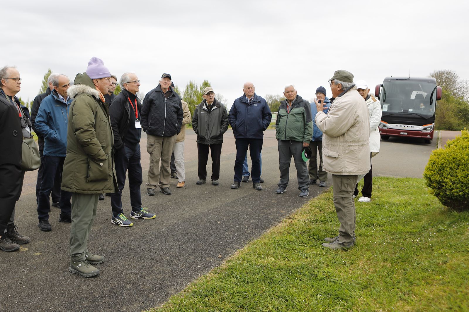 Der Kesselschlacht von Falaise ist das Mémorial de Montormel gewidmet. Das Memorial befindet sich auf einer Anhöhe, von hier hat man einen umfassenden Blick über das Schlachtfeld. In einem grossen Raum im Museum konnten parallel die Aktionen der beteiligten Truppen auf dem Bildschirm und im Gelände verfolgt werden. Anschliessend fuhren wir das Gelände im Bus ab. Wir erlebten faktisch den wechselnden Frontverlauf nach. Eine damals bis zum Schluss der Schlacht offene Lücke ermöglichte es den Deutschen, Truppen und wenig Material aus dem Kessel zu retten. Unser Referent, der Leiter des Memorials, befasst sich seit über 20 Jahren mit der Kesselschlacht. Er kennt jedes Schützenloch. Seine Erläuterungen waren lebendig, spannend und vor allem temporeich, dies, als wäre er selbst dabei gewesen. Zumindest für den Schreibenden, welcher die letzten 25 Jahre seines Berufslebens mit der englischen Sprache verbracht hat, waren die französischen Erläuterungen sehr herausfordernd.