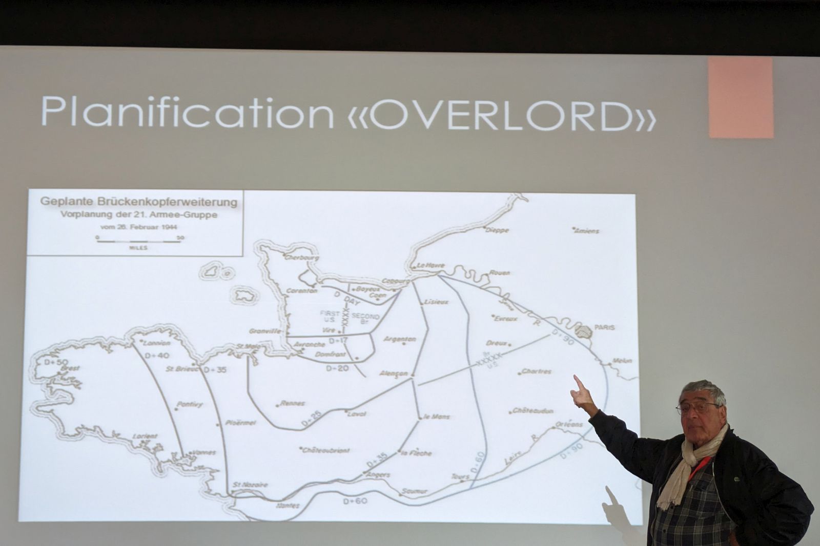 Die erfolgreiche alliierte Landung in der Normandie war ein wichtiger Teil der gesamten Operation ‘OVERLOARD’, entscheidend für den weiteren Verlauf der 2. Front gegen Deutschland und den Vorstoss bis zur Deutschen Grenze waren die nachfolgenden Wochen und Monate. Dominique Juilland vermittelte anhand diverser Unterlagen einen Überblick über den Frontverlauf ab Mitte Juni 1944. Noch war die deutsche Wehrmacht in der Lage, einen Riegel, um den Brückenkopf der Alliierten zu bilden. Die entscheidende Schlacht fand Mitte August 1944 im Kessel von Falaise, südlich von Caen, statt. Nach schweren Kämpfen gelang es den Alliierten, die deutschen Truppen nachhaltig zu zerschlagen. Die Wehrmacht verlor dabei das Gros ihrer in Frankreich eingesetzten Panzer, ein grosser Teil der Truppen geriet in Gefangenschaft. Von diesen Verlusten konnte sich die Wehrmacht nicht mehr erholen, wenige Tage später, am 25. August 1944 marschierten die Alliierten in Paris ein. Mitentscheidend für diesen Erfolg war die alliierte Luftüberlegenheit, der die Deutschen nichts entgegenzusetzen hatten.
