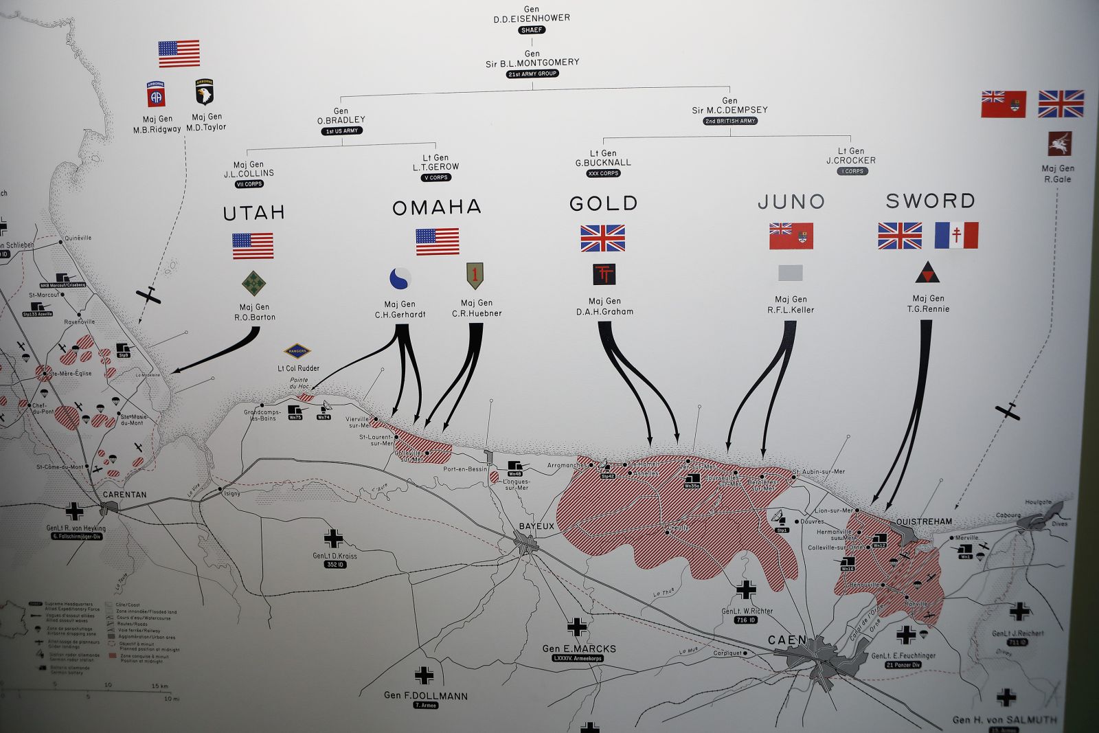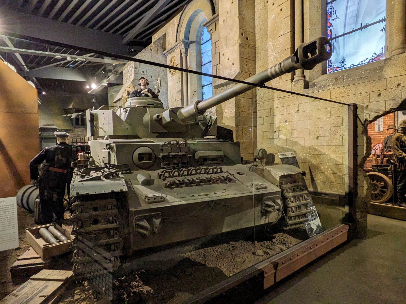 Nach dem morgendlichen Briefing besuchten wir das «Memorial de Caen», welches einen sehr umfassenden Einblick über den Zweiten Weltkrieg und den Kampf in der Normandie vermittelt. «The big picture». Im Felsen, tief unter dem Museum, befand sich das Hauptquartier von General Wilhelm Richter. Richter befehligte die Division, welche primär den Britischen und kanadischen Abschnitt zu verteidigen hatte. Innerhalb nur einer Woche verlor die Division über fünfzig Prozent ihrer Soldaten.