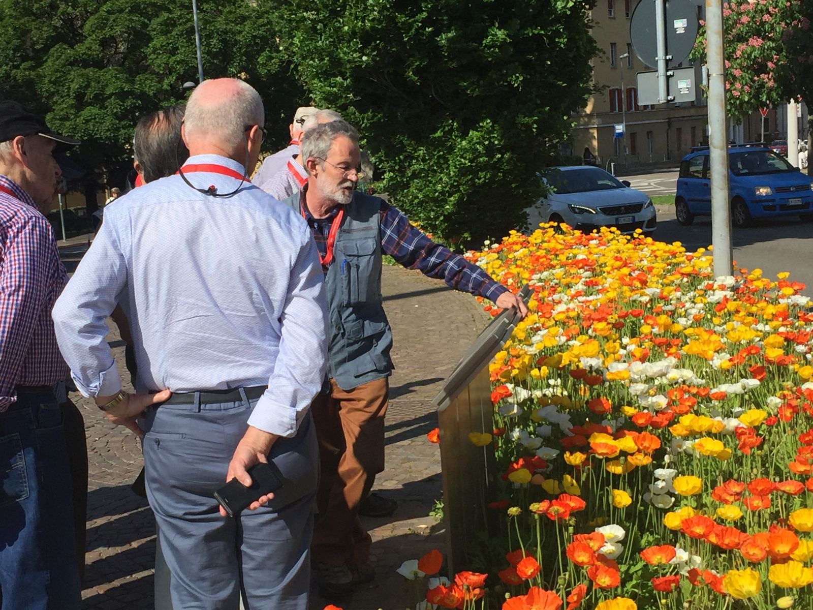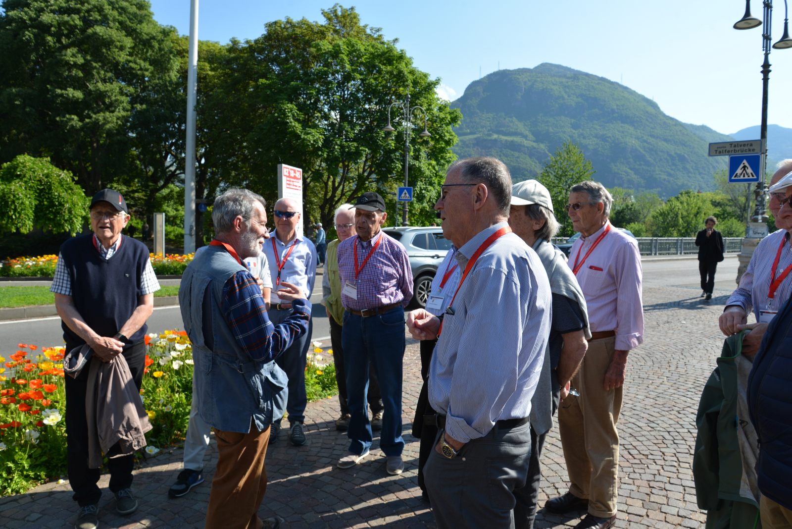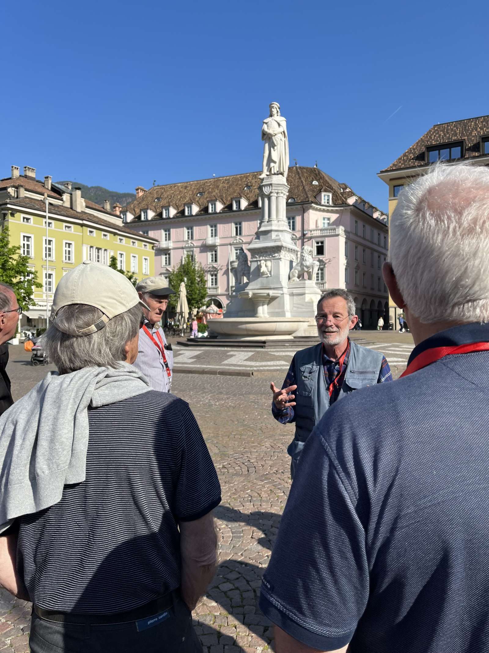 Ein sonniger Tag kündet sich! Direkt von der Lobby erreicht man durch drei Türen das Fahrzeug in einer ehemaligen Remise. Einst wurden dort wohl Kutschen untergestellt – nun dient er als Car-Garage. Unsere charmante Chauffeuse lenkt den Wagen in der intensiv genutzten Ebene dem Ritten entlang nach Bozen. In der Nähe des Bahnhofes Auslad, kurz einer Allee entlang um auf den Waltherplatz im Zentrum der Altstadt zu gelangen. Zweckhalt für fotografische Gruppenaufnahme unter dem Standbild des Lyrikers Walther von der Vogelweide (Burg in Wolkenstein im Grödnertal).