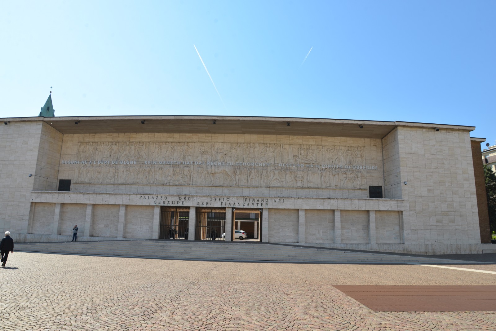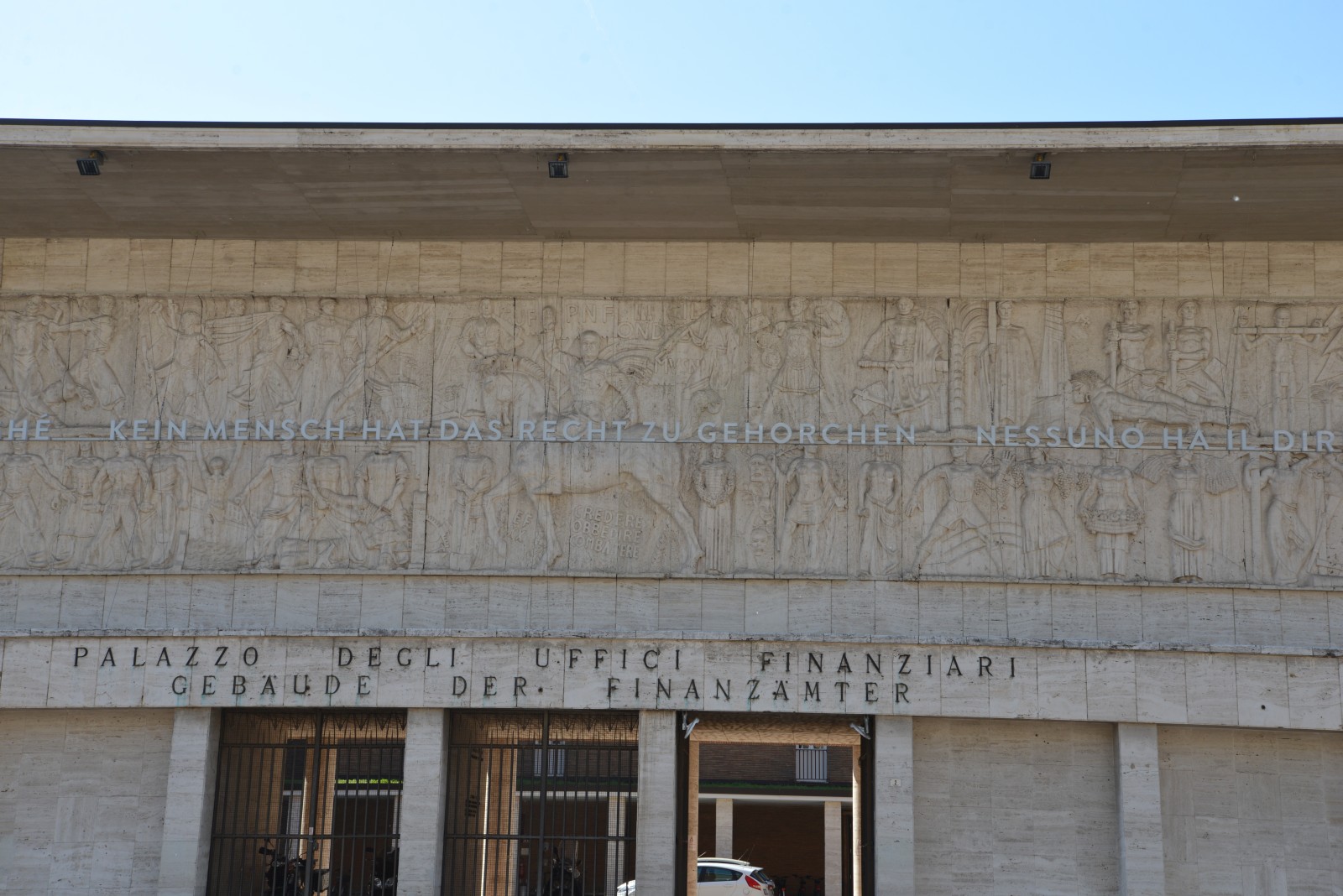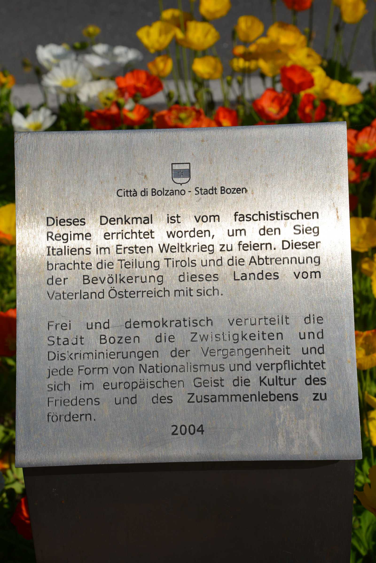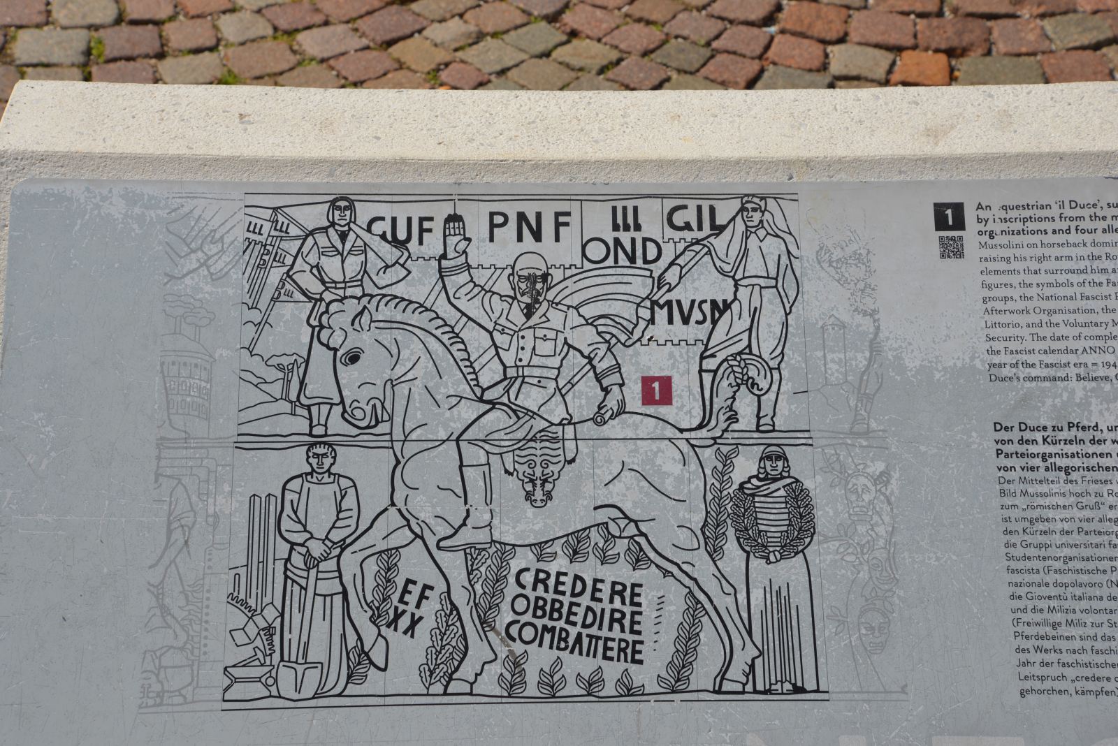 Die wunderschönen Blumenrabatten links und rechts der Zufahrtsstrasse lenken vom Denkmal vorübergehend ab. Im Blumenbeet wird zudem auf die Knacknuss der unliebsamen Vergangenheit (Faschismus) auf einer, behördlich verordnet klein gehaltenen Tafel, hingewiesen. Gutes Beispiel für das Heuchlerhafte ist die lieblos gestaltete Piazza vor dem Justiz-Palast und dem gegenüberliegend dominierenden Relief des reitenden Mussolini mit den faschistischen Schlagworten: Credere, Obbedire, Combattere (Glauben, gehorchen, kämpfen).