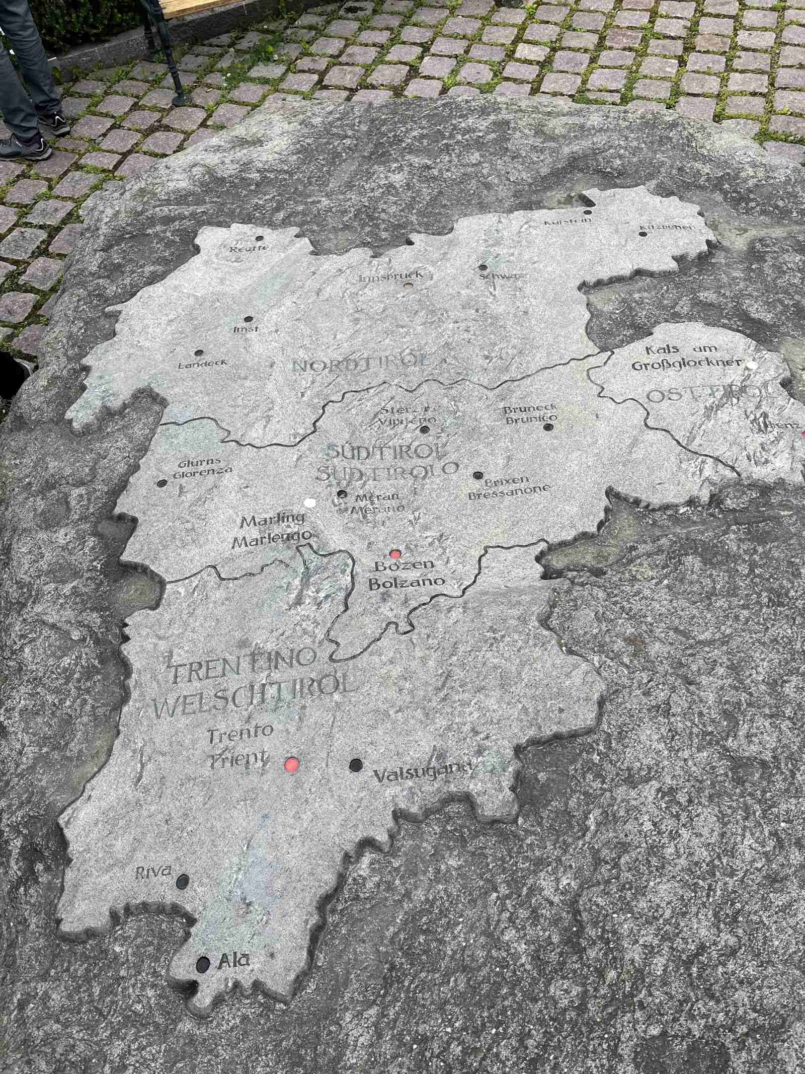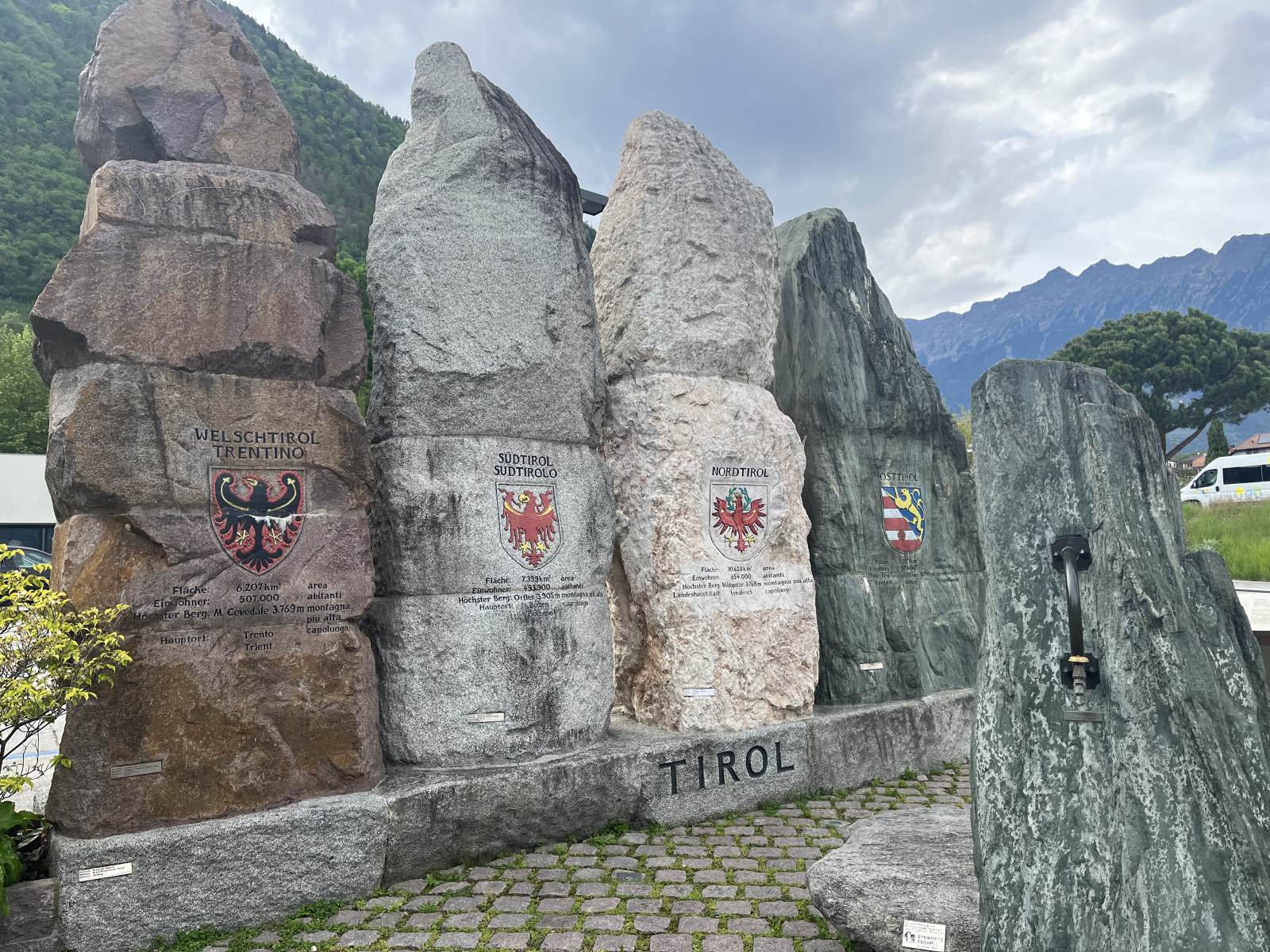 Die Weiterfahrt führte uns nach Marling. Auf dem Tiroler-Platz sind seit 2009 vier Fels-Elemente aus den jeweiligen Landesteilen zu fotografieren und erinnern an die ungetrennte Tiroler-Geschichte.