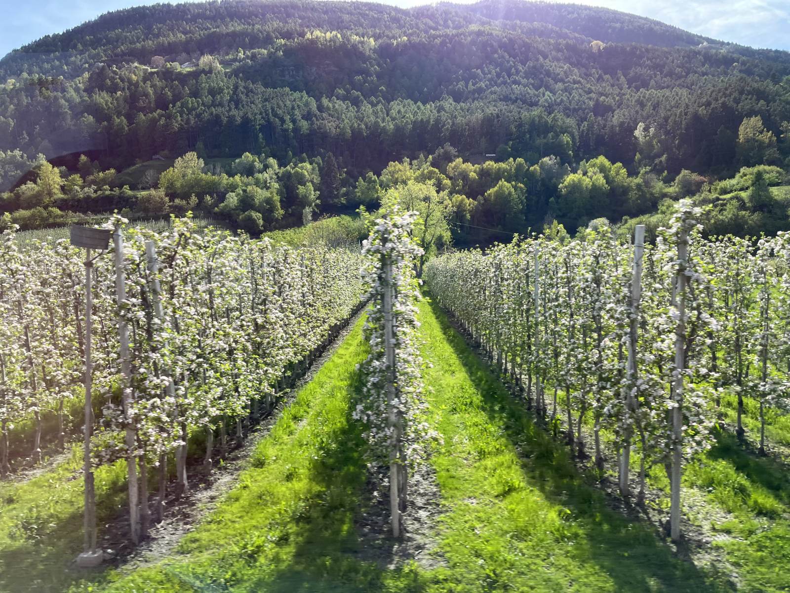 Nach Taufers tauchen wir ein in die beginnende Blüte der schachbrettartig angelegten Obstplantagen im Vinschgau. Kurzweiliges Reisen durch die Ortschaften und der Etsch entlang nach Meran.