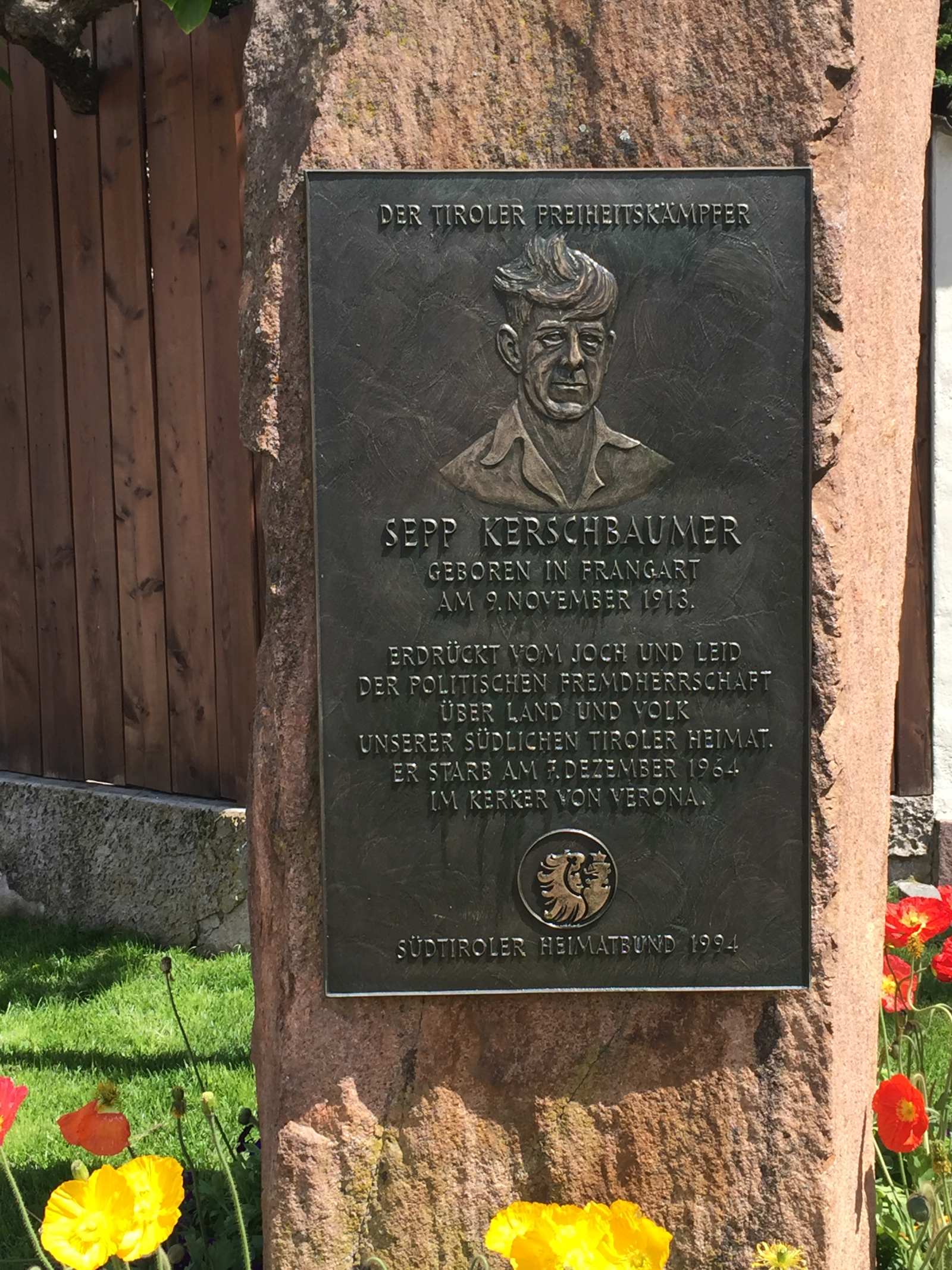 Ganz in der Nähe liegt der Weiler Frangart. Zu Beginn am kleinen Strässchen zum sehr gepflegten Gottesacker ziert eine Holzplastik das Antlitz von Sepp Kerschbaumer welcher nach den Mailänder-Prozessen in der Haft am 7. Dezember 1964 verstorben ist. Die Beerdigung wird ein neues «Sigmundskron». Am Abschied dieses sanften Idealisten haben Zehntausende von Südtiroler teilgenommen.