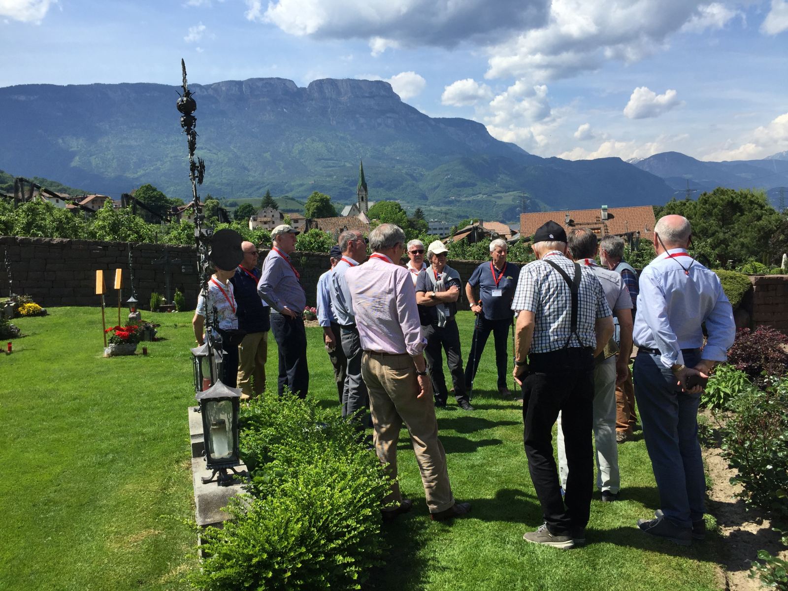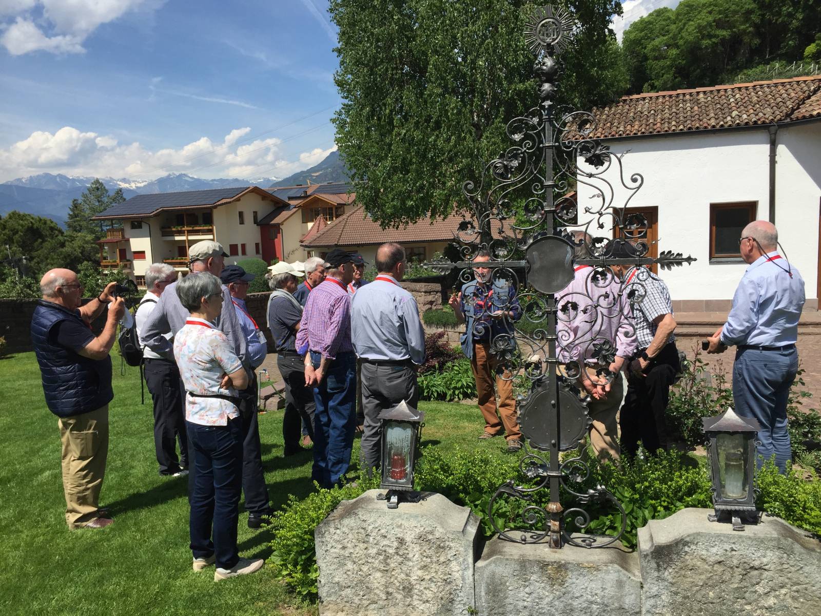 Die umfassende Aussicht direkt unterhalb der Kirche über den Talkessel von Meran fesselt. Angelehnt an einer überwucherten Mauer mit Efeu referiert unser umsichtiger Leiter über die Feuernacht vom 11./12. Juni 1961 bei der über vierzig Anschläge auf die Strom-Infrastruktur verübt worden sind.