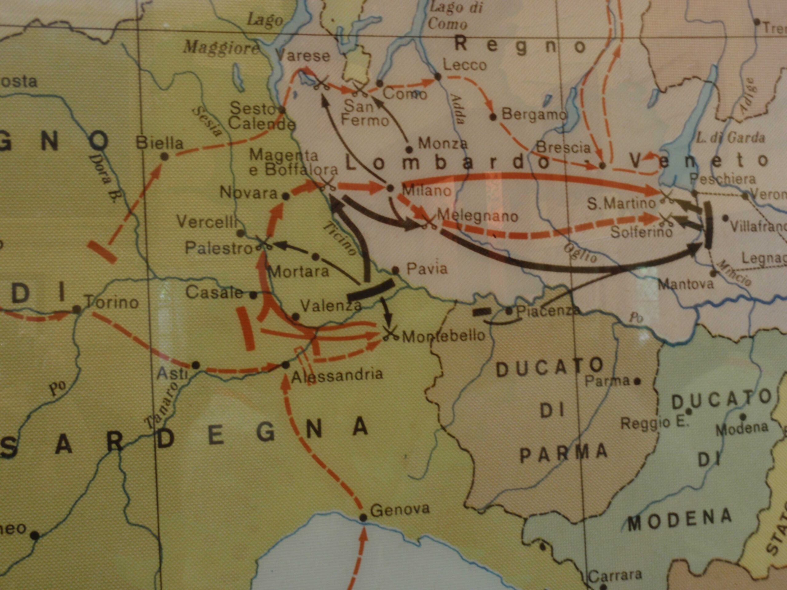 Im ersten Unabhängigkeitskrieg (1848-1849) gab es in Italien wie in anderen Ländern Europas Volksaufstände; in der Märzrevolution versuchten insbesondere Mailand und Venedig die österreichische Herrschaft abzuschütteln. Der Hauptkriegsschauplatz war das österreichische Festungsviereck am Mincio und an der Etsch, Peschiera – Verona – Legnago – Mantova. Das Eingreifen von Sardinien-Piemont führte zum Sieg in der Schlacht von Goito, worauf auch die österreichische Besatzung von Peschiera kapitulierte. Doch das Kriegsglück wendete sich danach abrupt, weil der König beider Sizilien, Ferdinand II., aufgrund seiner bedrohten Situation in seinem Reich sich aus Norditalien zurückzog und auch der Papst den Rückzug seiner Truppen anordnete. In der Schlacht bei Custozza errangen die österreichischen Truppen den entscheidenden Sieg.