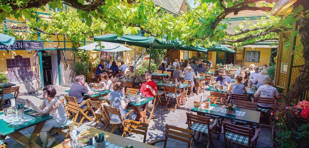 Gut gelaunt und gestärkt bestiegen wir den Bus, wohl wissend, dass uns nach einer Verdauungsfahrt der Heurige «Maier am Pfarrplatz» in Heiligenstadt mit einem vermutlich ebenso üppigen Buffet wie die Dekorationen im Schloss Hof erwartet.