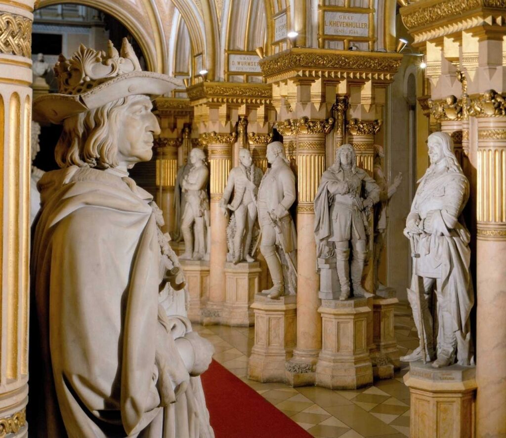 Wie Karyatiden stehen sie da, die Verteidiger Österreichs, laden ein, die Treppe zu besteigen und in die Ruhmeshalle einzutreten. Einzelne Episoden ihrer Schlachten und Siege sind in 45 Fresken im Hauptsaal des Museumsgebäudes dargestellt. An den Wänden befinden sich Tafeln aus rotem Marmor mit den Namen der gefallenen Obersten und Generäle des kaiserlichen Heeres zwischen dem Ausbruch des Dreissigjährigen Krieges (1618) bis zum Ende des Ersten Weltkrieges (1918).
