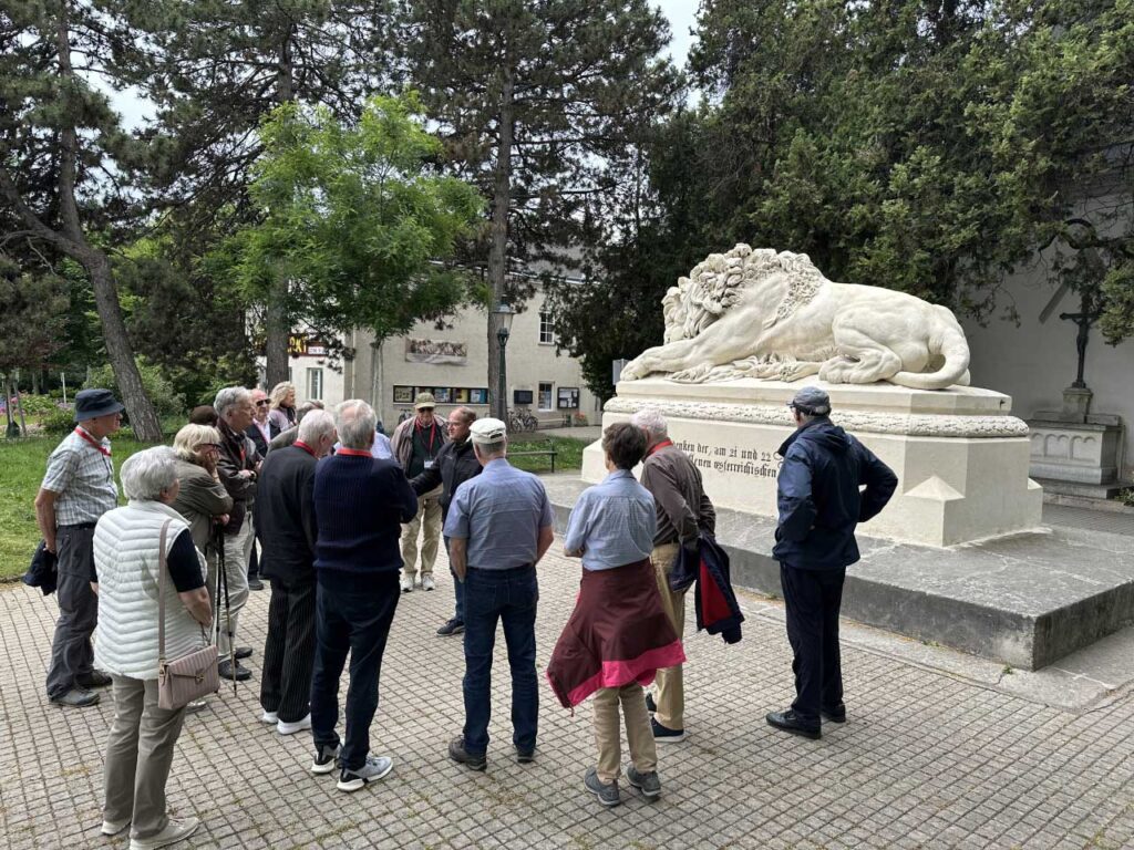 Was lag nach dem Aufklärungsspaziergang näher, als das Mittagessen am Ufer der Donau einzunehmen und den berühmten Donaukarpfen zu probieren? Nicht jedermanns Sache, aber für Kenner ein Gedicht! Nach der Stärkung zog es uns in die Gegend des Schlachtfeldes (heute Teil des 22. Wiener Bezirks). Ein privater Verein gründete und pflegt zwei Museen in Erinnerung an die grosse Schlacht bei Aspern, in der Erzherzog Karl von Österreich, der die österreichische Armee kommandierte, den Sieg davontrug. Eines davon ist der Schüttkasten in Essling, ein ehemaliger Getreidespeicher, den Napoleon mit 400 Mann zu einem strategischen Stützpunkt besetzte. Ein Besuch vor Ort zeigt in einem Diorama mit über 8500 Figuren detailgetreu und eindrücklich die Aufstellung der feindlichen Armeen. Uniformen, Waffen, Briefe, Zeugen der militärischen Auseinandersetzung sind zu bestaunen. Es ist ein berührendes Andenken an die über 20.000 Toten und Verwundeten auf beiden Seiten. Das zweite kleine Museum befindet sich in der Sebastianskapelle in Aspern, in dem noch mehr Erinnerungsstücke aufbewahrt werden. Auf dem kleinen Platz vor der Kapelle liegt auf einem Postament ein mächtig hingestreckter, sterbender Löwe. Er bedeckt mit seinem Körper einen napoleonischen Adler und den Imperatorenmantel.