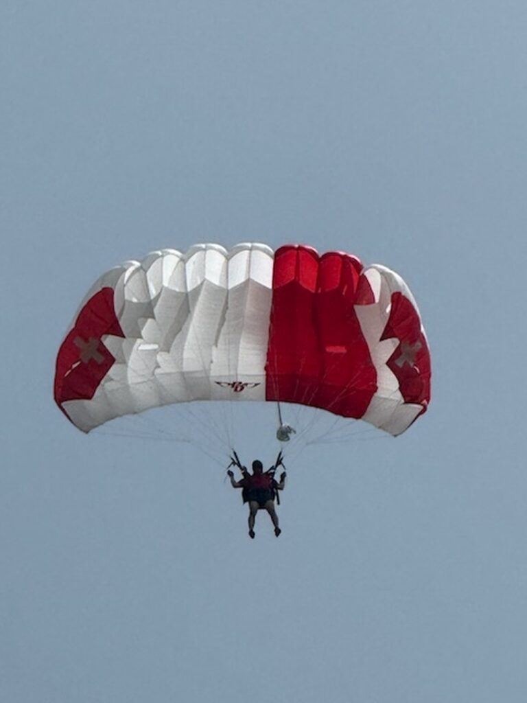 Noch während Nicolas Baumann redete, landeten die ersten Fallschirmspringer – leicht bekleidet, aber hochkonzentriert. Der erste setzte aus unserer Sicht einen Volltreffer: mitten auf dem winzigen Zielkreis, fast so präzise wie ein Schweizer Uhrwerk.