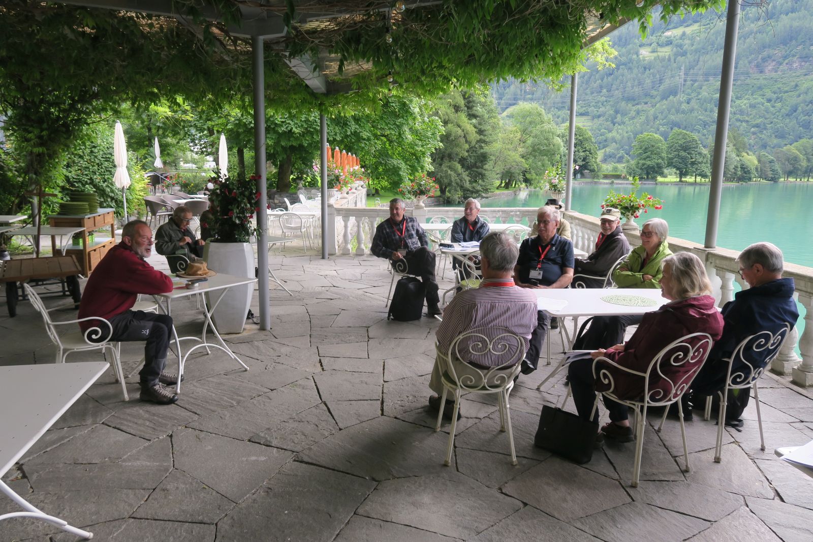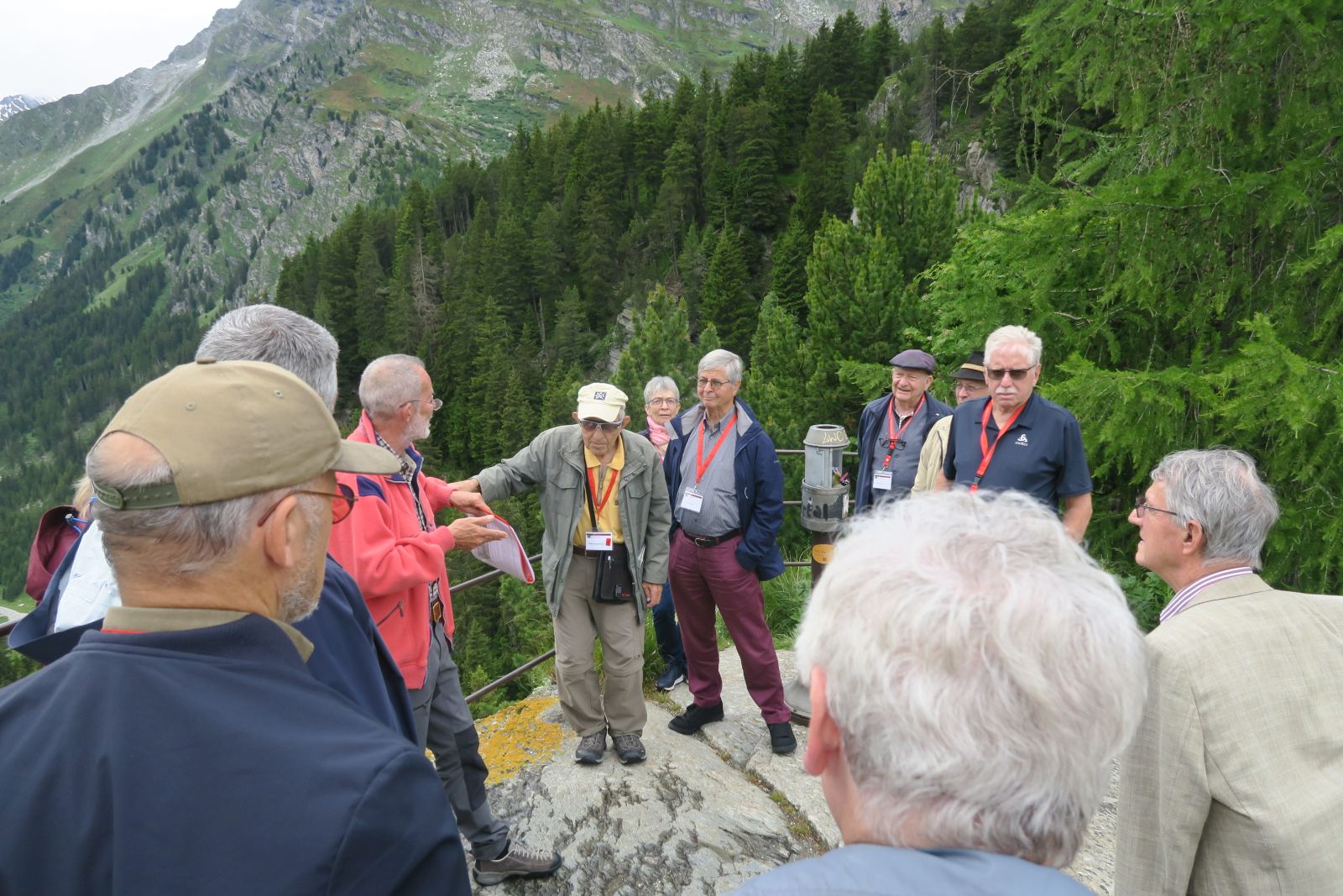 Nach dem Mittagessen in Silvaplana erfolgte nach kurzer Fahrt der erste Stopp auf dem Malojapass. Neben der Orientierung im Gelände wurde von David Accola auf Vieles hingewiesen: die eindrückliche Lage des Passes, seine militärische Bedeutung bis auf den heutigen Tag, die geologische Entstehung der Landschaft, den vor uns liegenden, strategisch bedeutungsvollen Murettopass, der vielen damals mehrmals als Fluchtweg ins oder vom Veltlin diente, hinter uns das Hotel Kulm, wo sich ja eine eindrückliche Szene in C. F. Meyers Roman abspielte. Der Zürcher Waser konnte dort in der Nacht im Nachbarzimmer einem Gespräch mitlauschen, in dem das Vorgehen der Katholiken besprochen wurde. Er erhielt so eine Vorausinformation zu den gegnerischen Plänen.