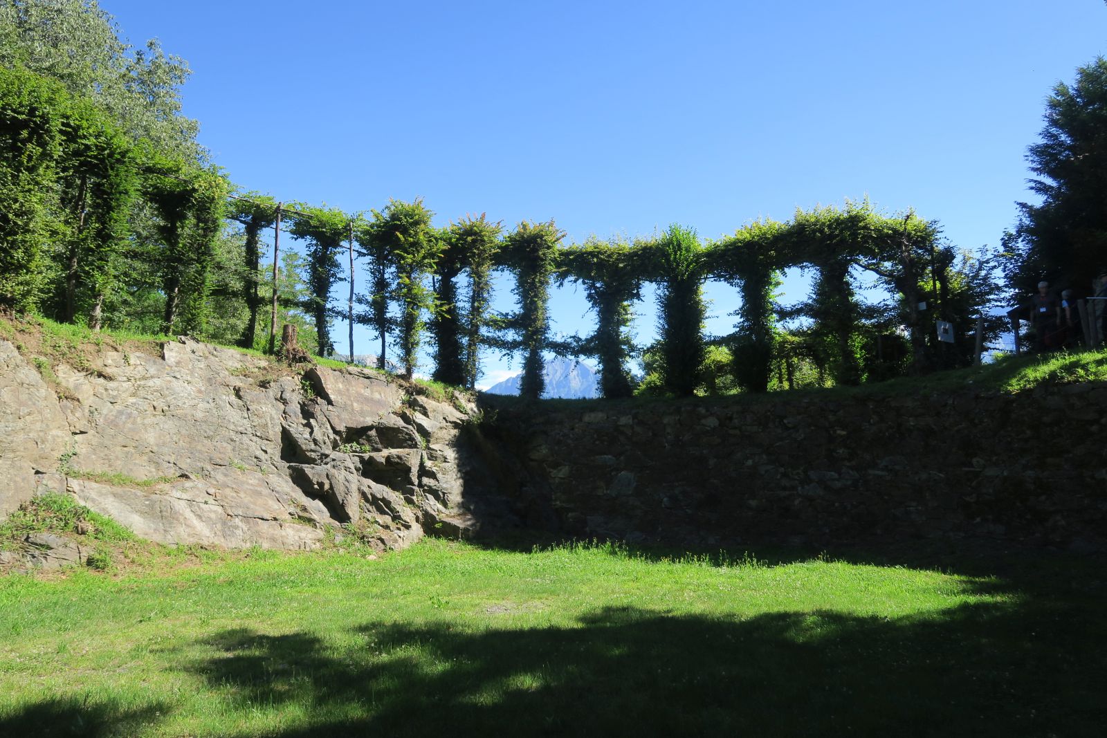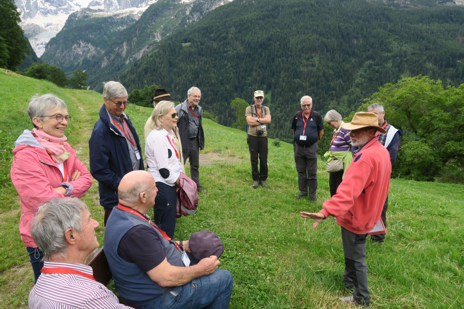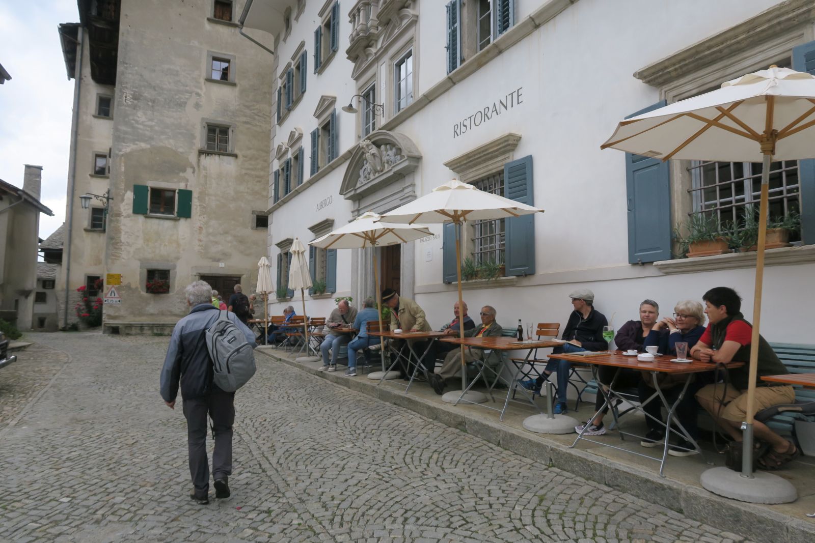 Die Fahrt durchs Bergell führte uns anschliessend hoch hinauf zur Sonnenterrasse von Soglio. Wir standen direkt dem Piz Badile und dem Piz Cengalo gegenüber und sahen so den Verlauf des jüngsten Bergsturzes von Bondo im August 2017. David erklärte uns vortrefflich die damalige Situation. Darauf erfolgte die Besichtigung des bekannten, wunderhübschen Gartens des Hotels Palazzo Salis-Soglio, wo wir auch gemütlich den Apero genossen.