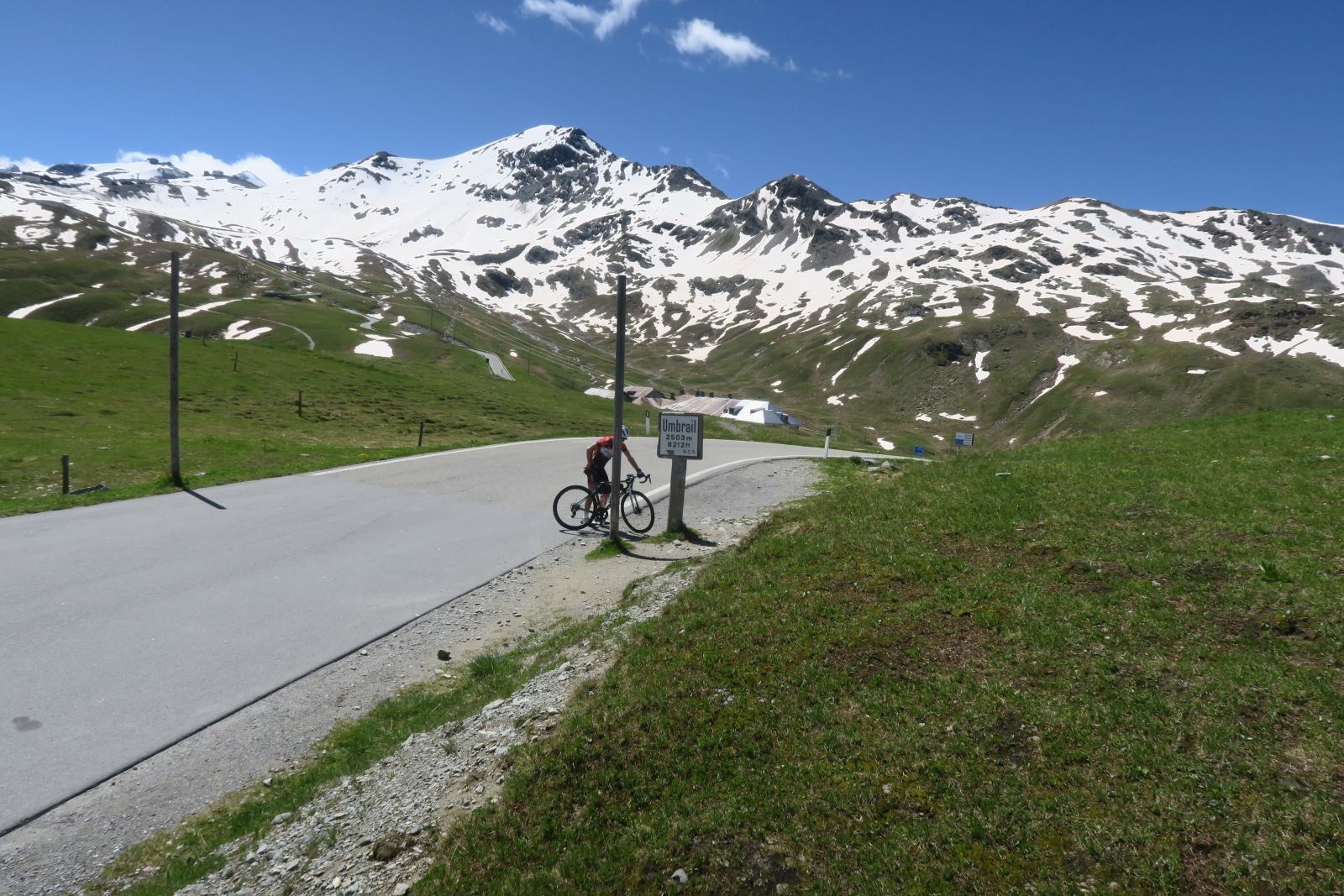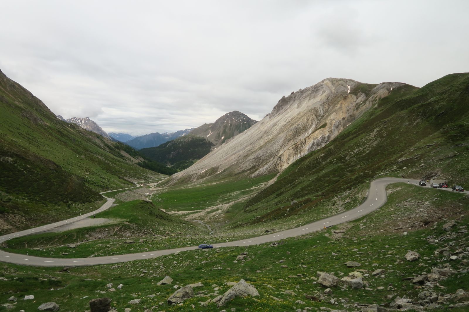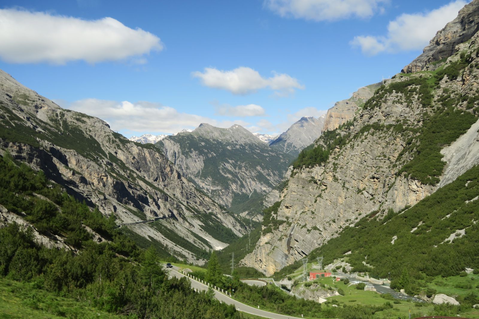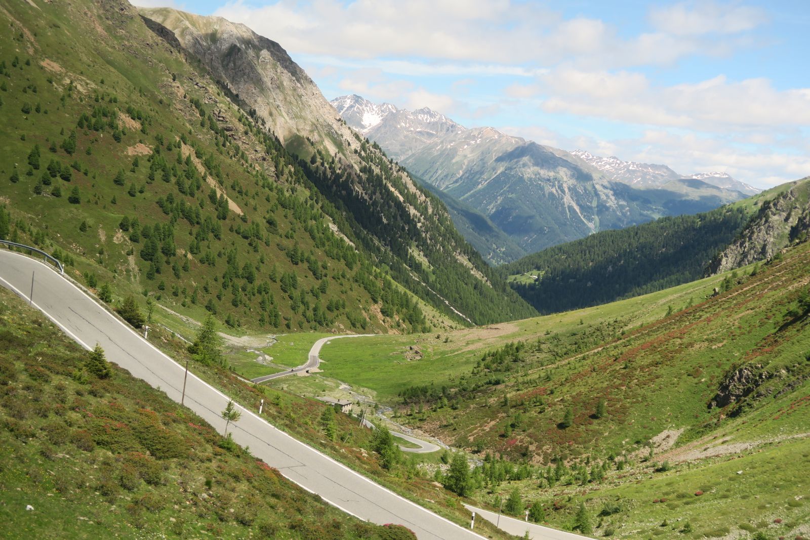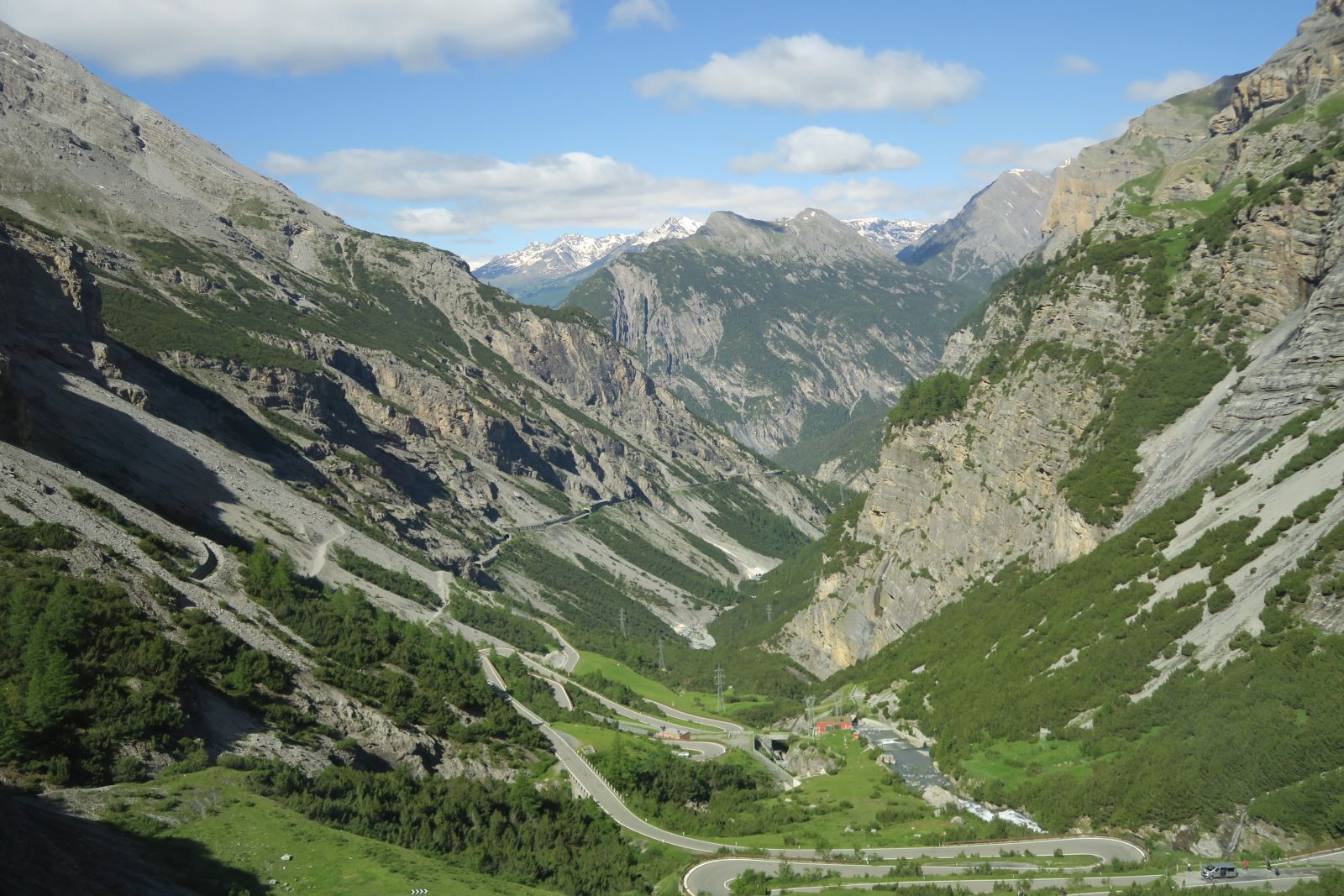 Via die kurvenreiche Anfahrt durch das Valle del Braulio gelangten wir zum Stilfserjoch auf 2757 müM. Das schöne Wetter erlaubte uns grossartige Einblicke auf Strassen, Skipisten und Berge.