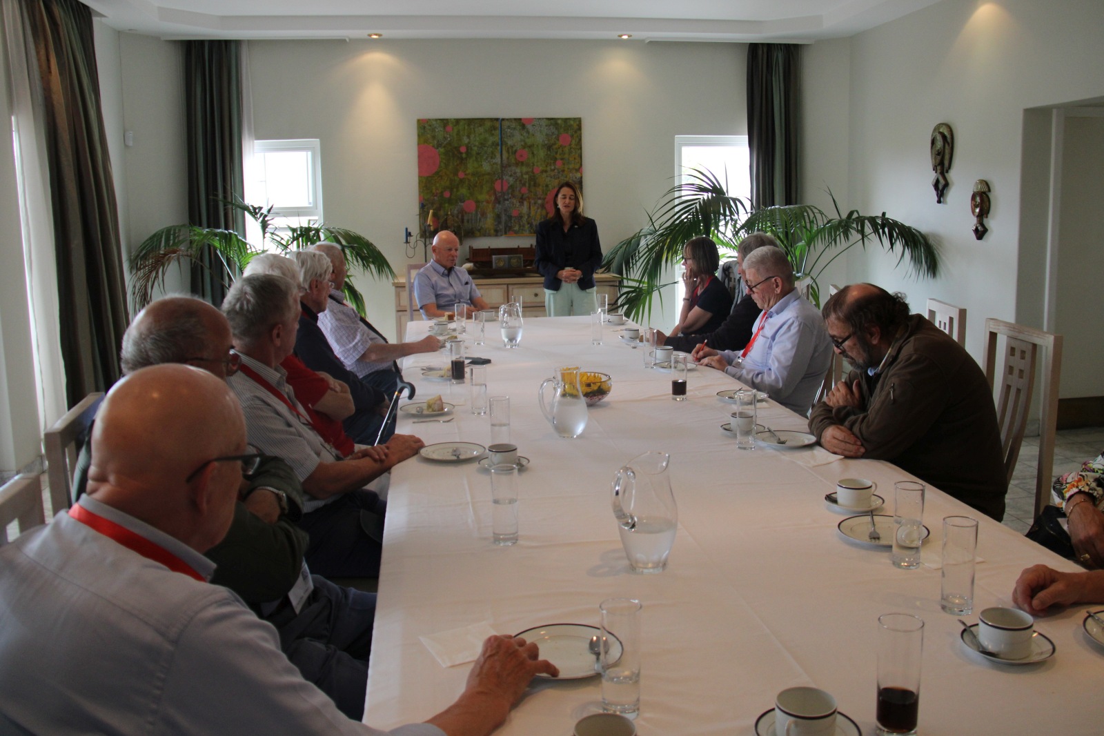 Nach dem Mittagessen im am ausgetrockneten Fluss gelegenen Riverview Restaurant werden wir im nahe gelegenen Villenquartier, wo alle stattlichen Häuser wegen nicht zu unterschätzender Kriminalität von Mauern umgeben, durch elektrische Zäune manchmal sogar noch durch Stacheldraht verstärkt sind, in der Residenz von EU-Botschafterin Beatriz Martins Geisler empfangen, die Urs Gerber schon seit seiner Tätigkeit in der Waffenstillstandskommission in Korea kennt. In ihren Ausführungen orientiert sie als Bürgerin der Bundesrepublik, des gewichtigsten Geldgebers des Entwicklungslandes darüber, dass man sich in der strategischen Zusammenarbeit auf die Beratung zum Aufbau einer grünen, auf Solarenergie beruhenden Wasserstoff-Technologie konzentriere und daneben Unterstützung leiste in der Berufsausbildung sowie in der administrativen, gesetzgeberischen Arbeit der namibischen Regierung.