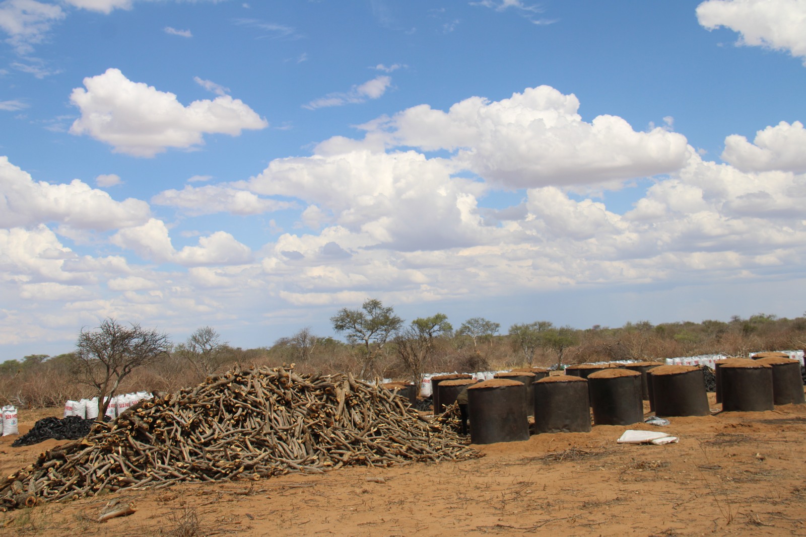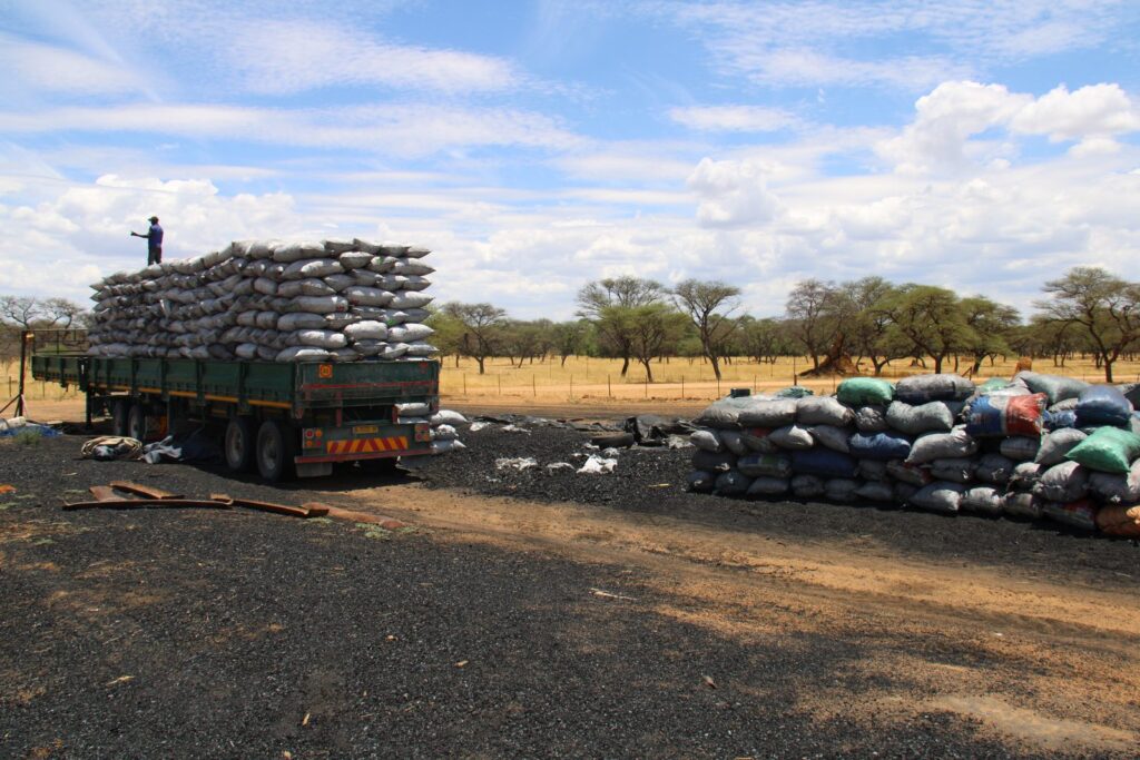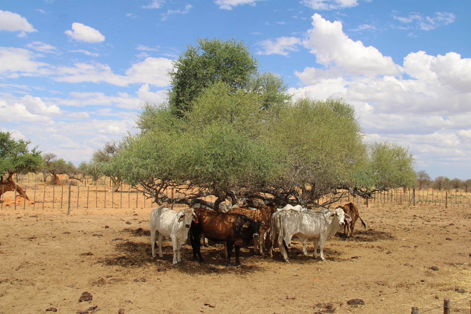 … besuchen wir die Hamakari-Farm, wo wir von der Besitzerfamilie Diekmann, die seit 1908 hier in 5. Generation auf ihrer 20’000 ha umfassenden Farm lebt, freundlich empfangen werden. Sie betreibt Rinderviehzucht, stellt Holzkohle her und auf ihrer Wildtierfarm kann auch Jagd betrieben werden. Auf unseren beiden, je etwa zwei Stunden dauernden Rundfahrten besichtigen wir die Rinderzucht, die hier durch Kreuzung der Schweizer Simmentaler-Rasse mit der in Indien als heilig geltenden Brahman-Kuh betrieben wird. 2000 to Bio-Rindfleisch werden jährlich vornehmlich nach Skandinavien exportiert. 120 Arbeiter betreuen den Rinderbestand, leben in einfachsten Blechhütten, sind aber ihrerseits Besitzer von 10 % der rund 1500 Rinder. Dadurch wird die Identifikation der Arbeiter mit der Farm gefördert. Eine Gruppe von rund 180 dem Sohn Diekmann unterstehenden, überwiegend angolanischen, weil arbeitsameren Arbeitern bereiten nach Europa zu exportierende, FSC-zertifizierte Holzkohle aus den wild wachsenden Dornenbüschen zu.