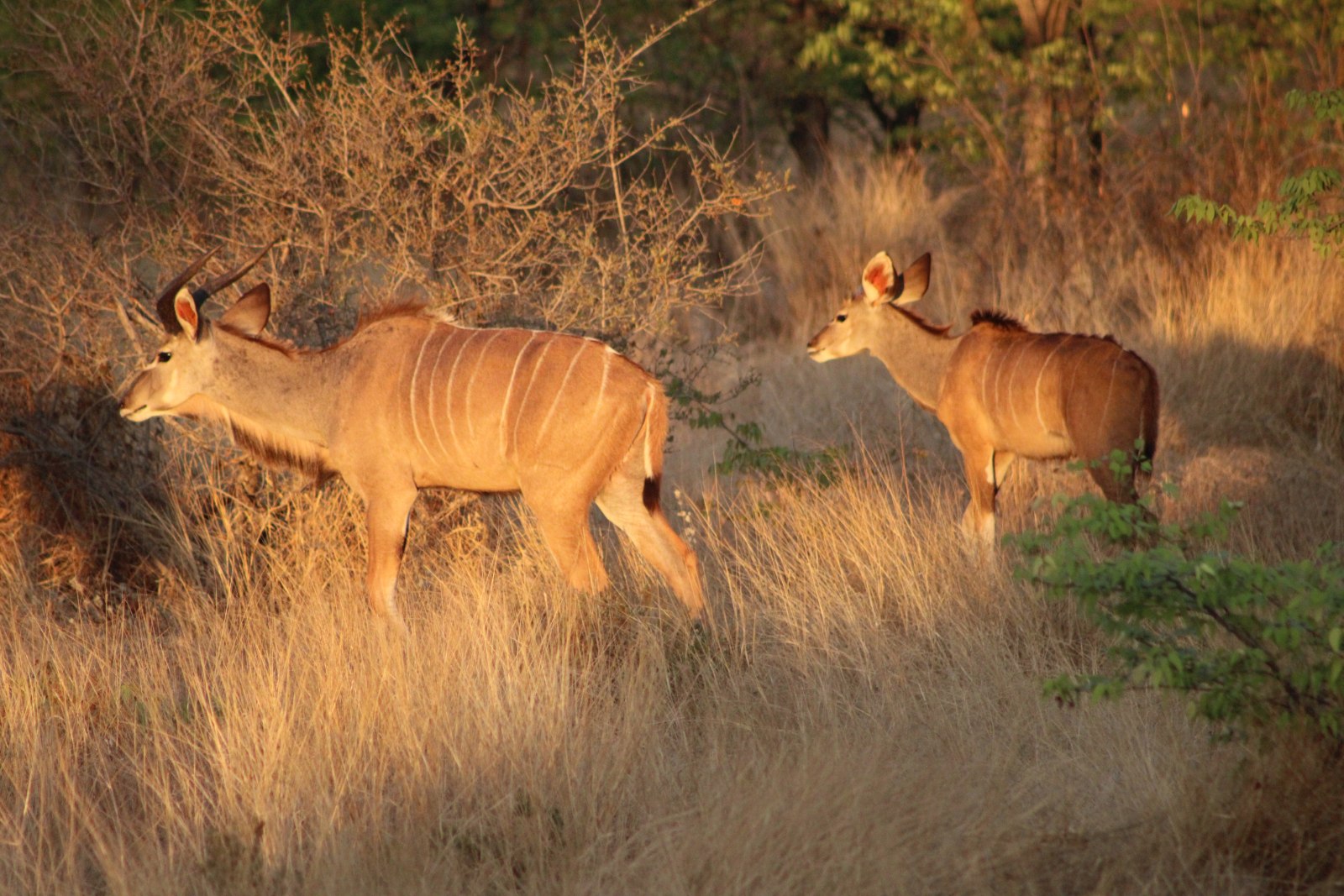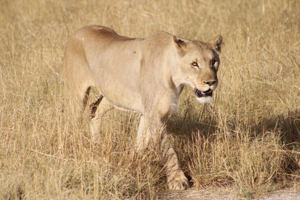 In der befahrbaren, weitgehend ebenen, nur mit schwacher Fauna bewachsenen Fläche präsentieren sich Giraffen, Springböcke, Elenantilopen, Herden von Gnus, rund zehn Elefanten mit ihrem Nachwuchs, zwei Nashörner und was uns speziell in Bann zieht: ein Löwenpaar auf Pirsch, um sich aus der grossen Herde Gnus eines für die Abendmahlzeit auszusuchen. Die Löwin geht dabei rund 100 Metern ihrem Herrn und Gebieter voraus und wird wohl auch weitgehend für die Jagd zuständig gewesen sein. Ein lehrreicher Anschauungsunterricht für alle Nicht-Infanteristen.