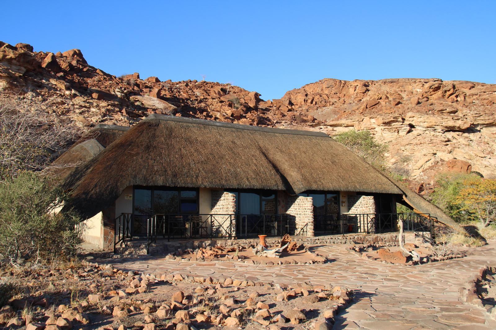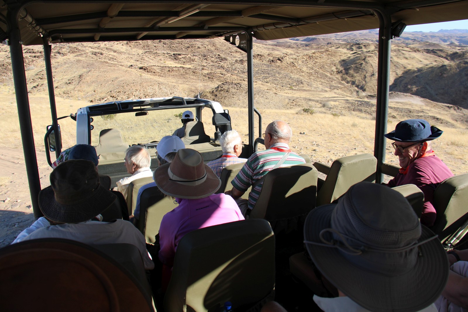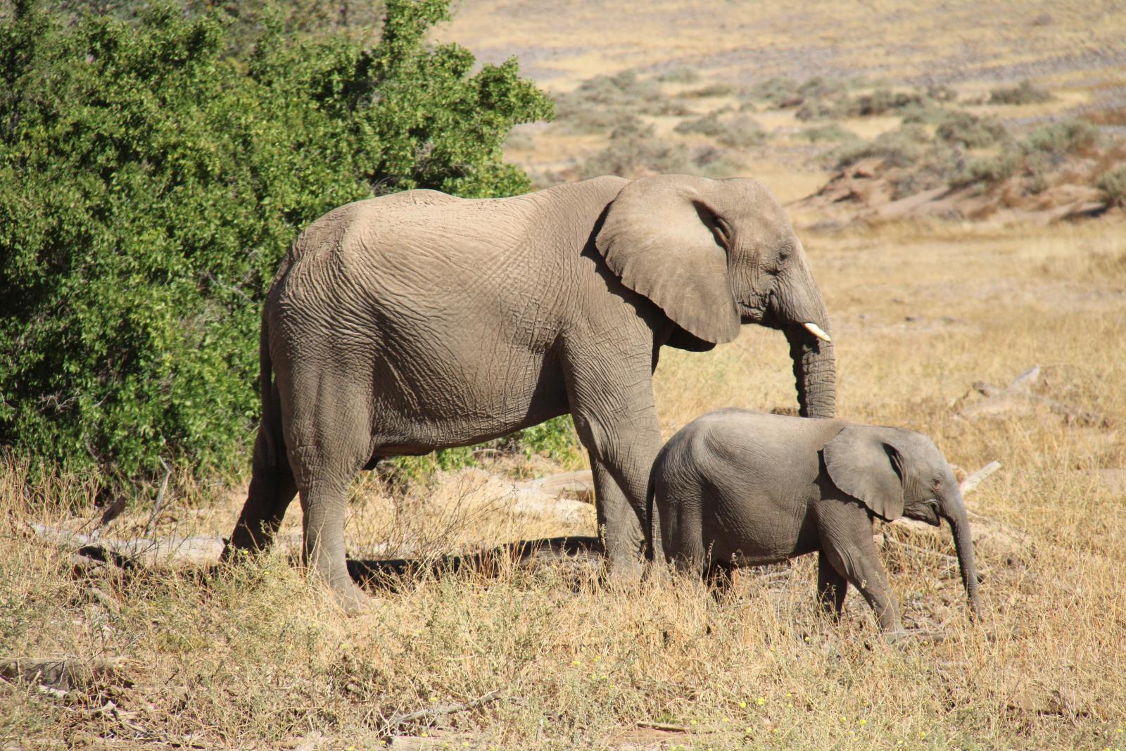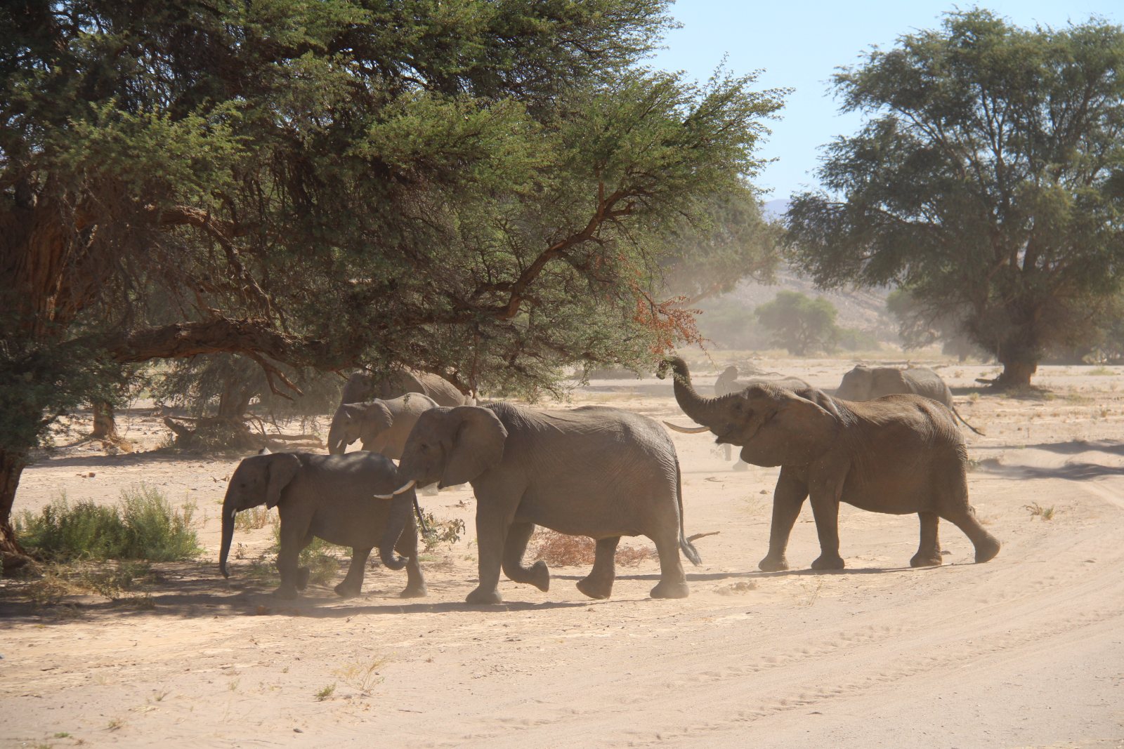 In einer fünfstündigen Fahrt zur Hälfte auf nicht asphaltierter Strasse erreichen wir die Twyfelfontain Country Lodge, die durch ihre Lage an einem unmittelbaren Felsabsturz und durch ihre spezielle Architektur beeindruckt. Nachmittags führt uns ein Ranger in das für seine vergleichsweise kleingewachsenen Wüstenelefanten bekannte Abu Huab River Valley. Wir treffen dort auf die etwa 25 derselben Familie angehörenden Elefanten, von welchen ein Jungtier sich am Rückspiegel unseres Fahrzeuges zu schaffen macht. Auf der Rückfahrt führt uns der Weg über die umliegenden Berge und wir bekommen einen Eindruck des wunderschönen, komplett menschenleeren Raums des nordwestlichen Namibias.