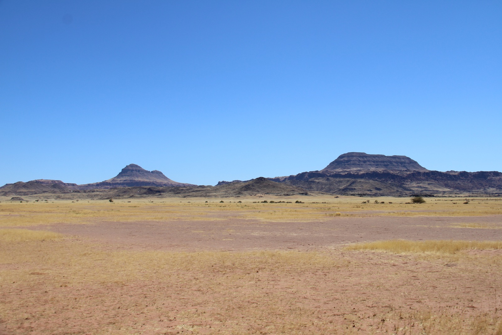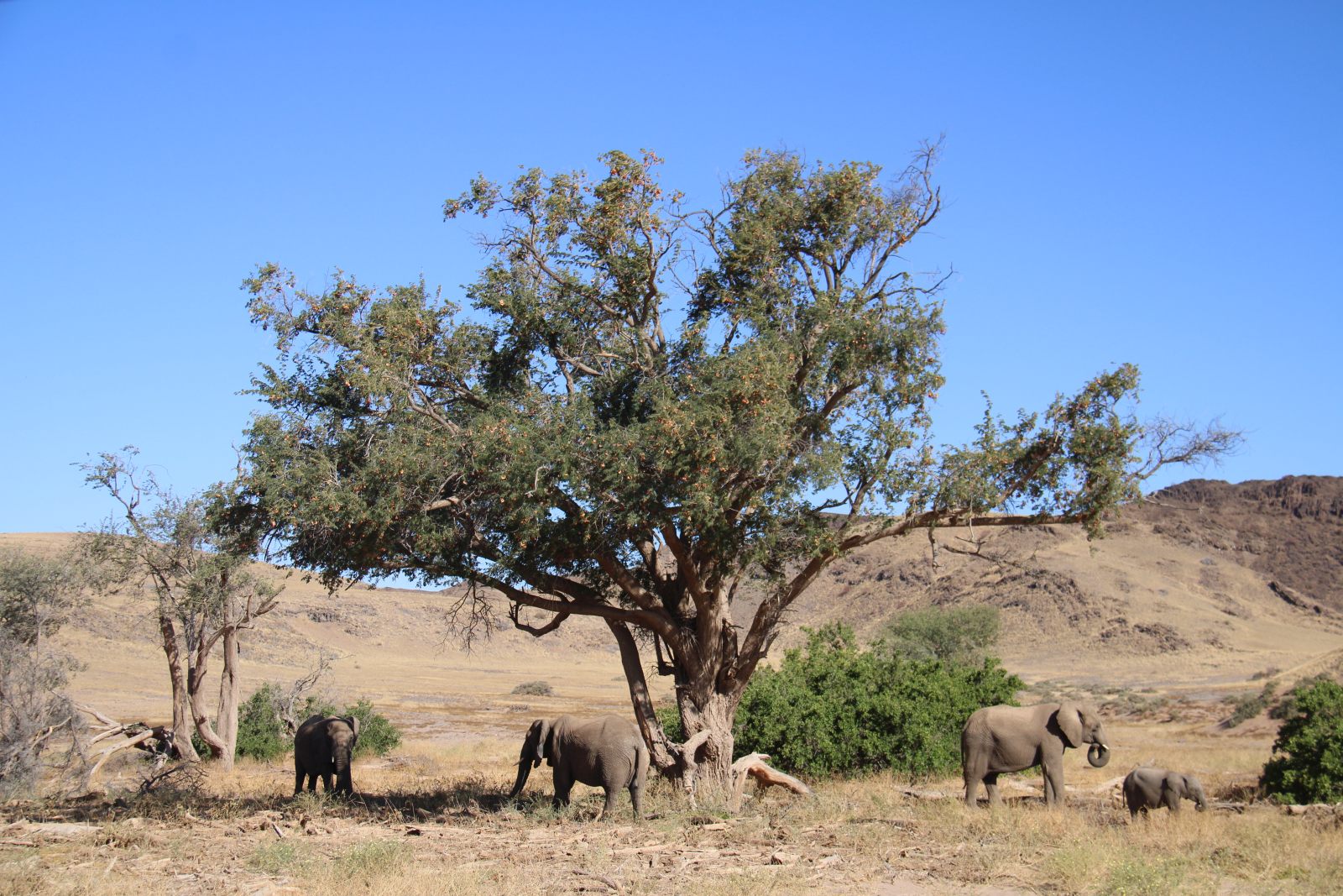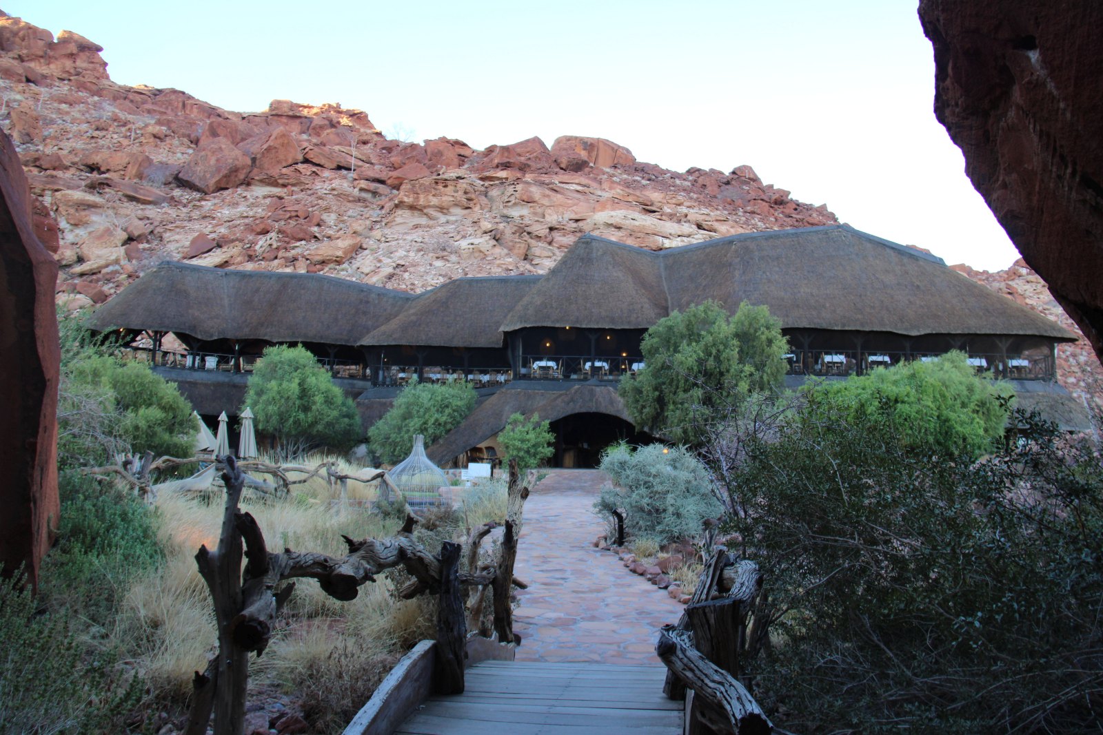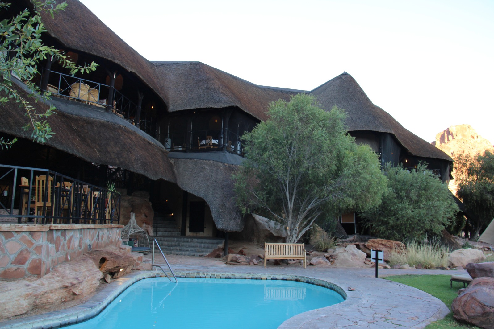 In einer fünfstündigen Fahrt zur Hälfte auf nicht asphaltierter Strasse erreichen wir die Twyfelfontain Country Lodge, die durch ihre Lage an einem unmittelbaren Felsabsturz und durch ihre spezielle Architektur beeindruckt. Nachmittags führt uns ein Ranger in das für seine vergleichsweise kleingewachsenen Wüstenelefanten bekannte Abu Huab River Valley. Wir treffen dort auf die etwa 25 derselben Familie angehörenden Elefanten, von welchen ein Jungtier sich am Rückspiegel unseres Fahrzeuges zu schaffen macht. Auf der Rückfahrt führt uns der Weg über die umliegenden Berge und wir bekommen einen Eindruck des wunderschönen, komplett menschenleeren Raums des nordwestlichen Namibias.