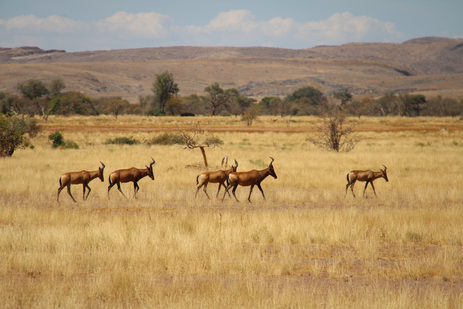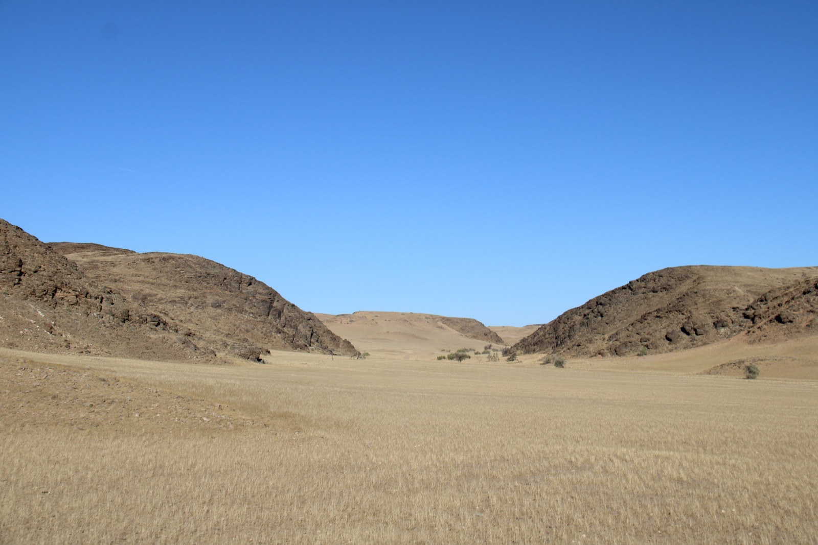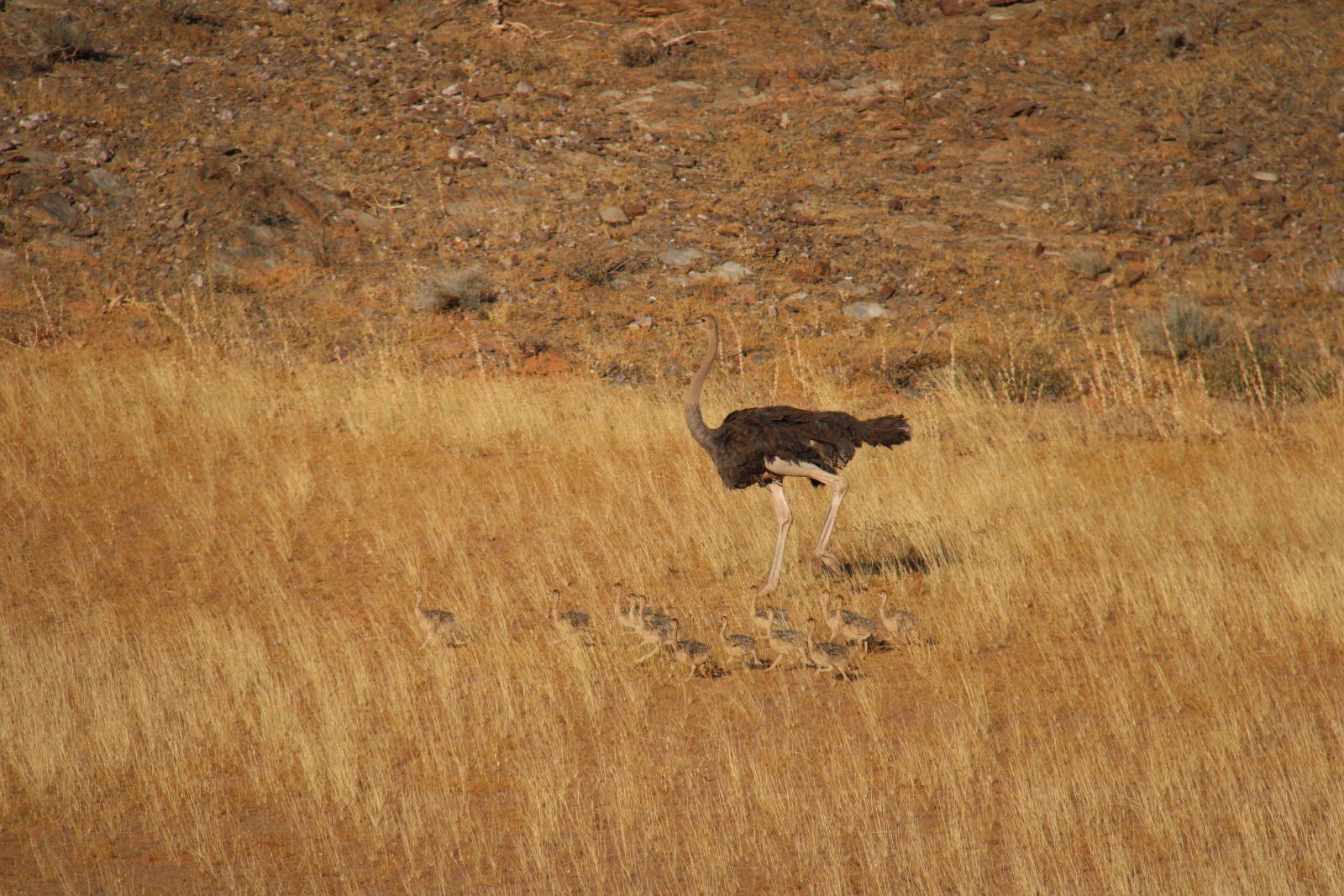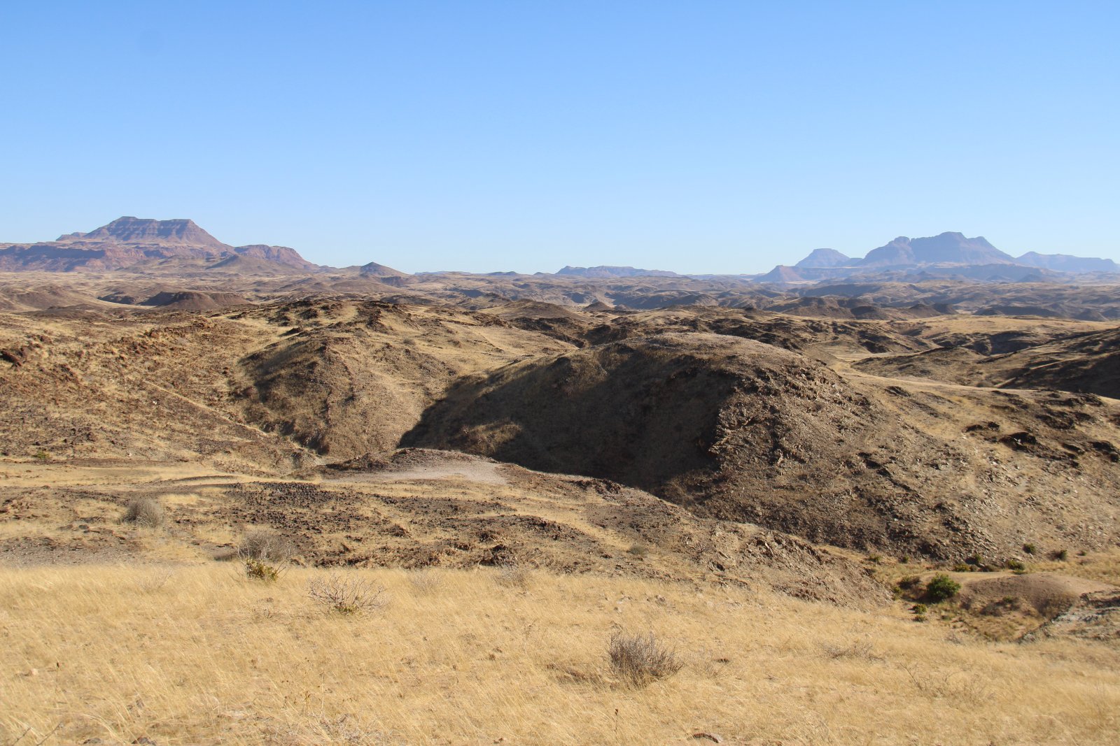 In einer fünfstündigen Fahrt zur Hälfte auf nicht asphaltierter Strasse erreichen wir die Twyfelfontain Country Lodge, die durch ihre Lage an einem unmittelbaren Felsabsturz und durch ihre spezielle Architektur beeindruckt. Nachmittags führt uns ein Ranger in das für seine vergleichsweise kleingewachsenen Wüstenelefanten bekannte Abu Huab River Valley. Wir treffen dort auf die etwa 25 derselben Familie angehörenden Elefanten, von welchen ein Jungtier sich am Rückspiegel unseres Fahrzeuges zu schaffen macht. Auf der Rückfahrt führt uns der Weg über die umliegenden Berge und wir bekommen einen Eindruck des wunderschönen, komplett menschenleeren Raums des nordwestlichen Namibias.