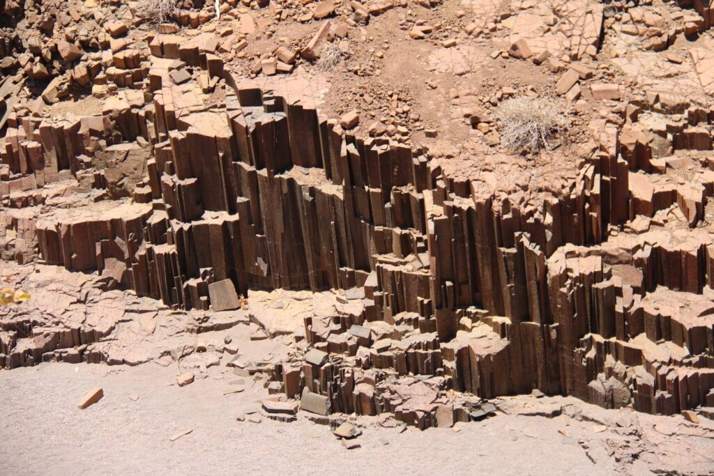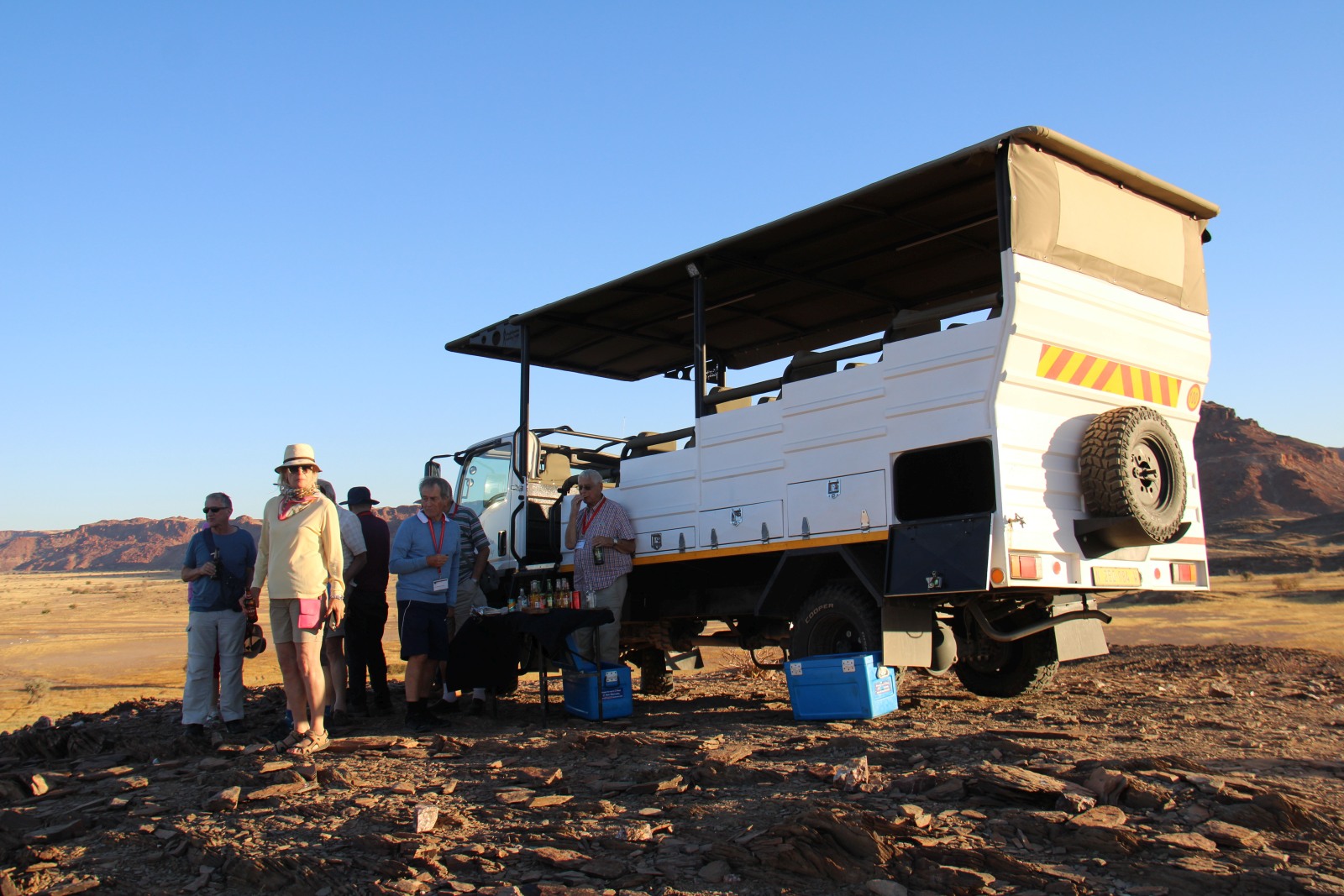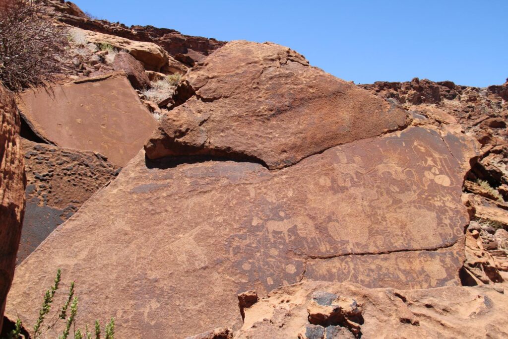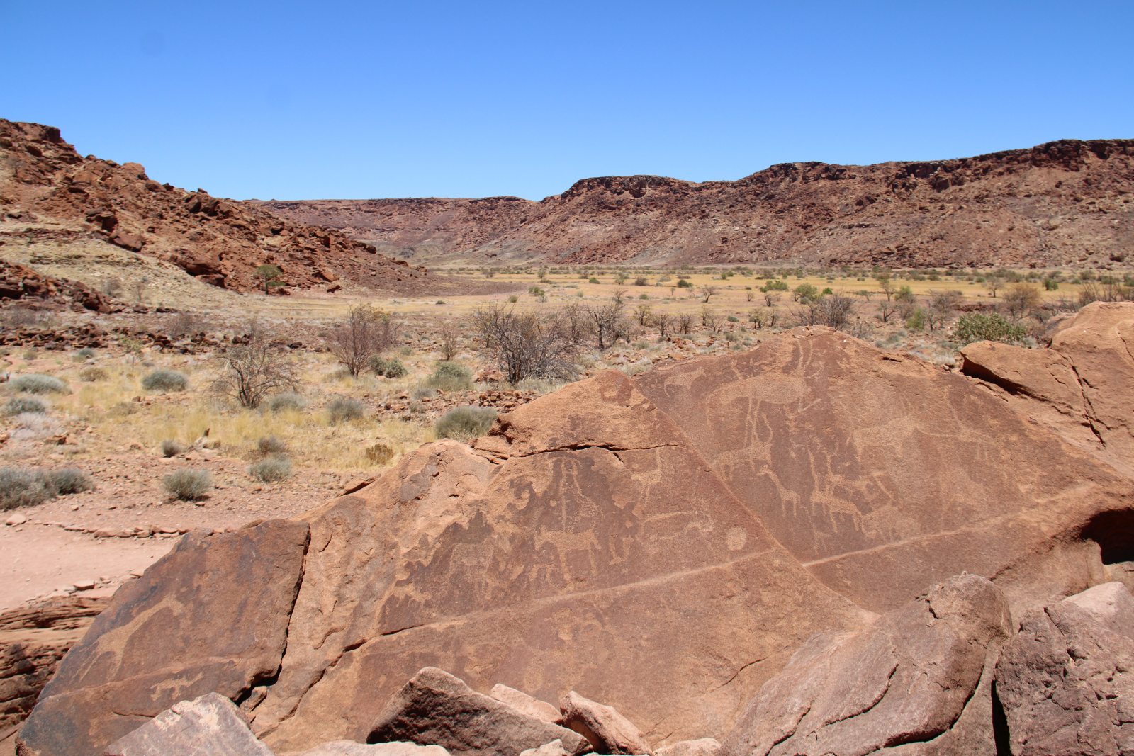 In den Vierzigerjahren des letzten Jahrhunderts hat ein Deutscher jahrtausendealte Felsmalereien entdeckt, die auf von Bergsturz herrührenden, mit grossen Flächen versehenen Felsen ohne Beeinträchtigung über die lange Zeit zu sehen sind. Dieser Fund ist im Jahr 2007 ins Inventar des UNESCO-Weltkulturerbes aufgenommen worden. Rund die Hälfte der GMS-Mitglieder, die der Bergsteigerfraktion hinzuzuzählen sind, wagen den beschwerlichen Weg zu diesen Felszeichnungen. Auf dem Rückweg zur Lodge wird noch ein kurzer Halt bei den Organpipes eingeschaltet, die als vulkanische Bestandteile durch vertikale Verschiebungen unter grossem Druck entstanden sind. Gleich daneben ist der wahrscheinlich unter ähnlichen Umständen entstandene Burnt Mountain zu sehen.