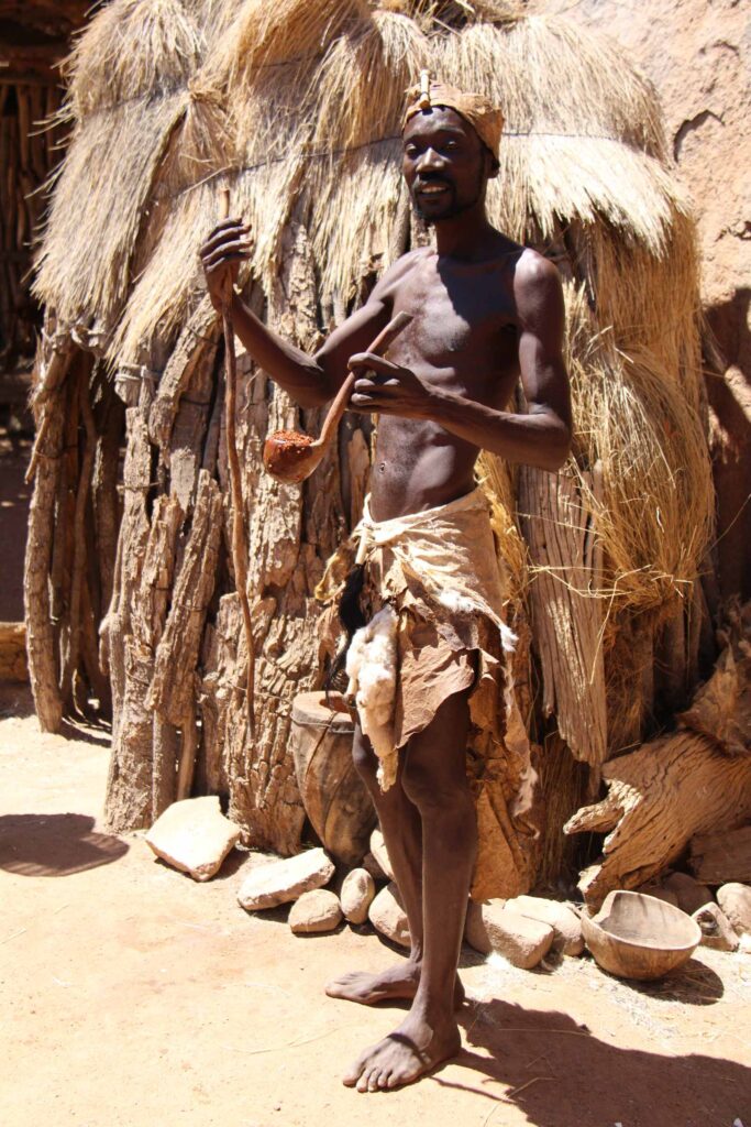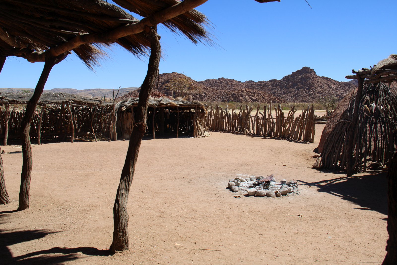 Im Damara Living Museum zeigen uns Angehörige eines der grössten namibischen Stämme, die Damaras, ihre Traditionen: Die auf Pflanzen beruhende Heilkunde, die Entfachung von Feuer durch Reibung von verschiedenen Hölzern und die Herstellung von Schmuckgegenständen mit einfachsten Materialien wie Eierschalen durch die Frauen. Dies wird uns von einem recht gut deutsch sprechenden Schwarzen auf originelle Weise und zum Teil auch in seiner durch eigenartige, unbeschreibliche Klicks mit der Zunge ergänzten Sprache erklärt, die wir erfolglos zu imitieren versuchen.