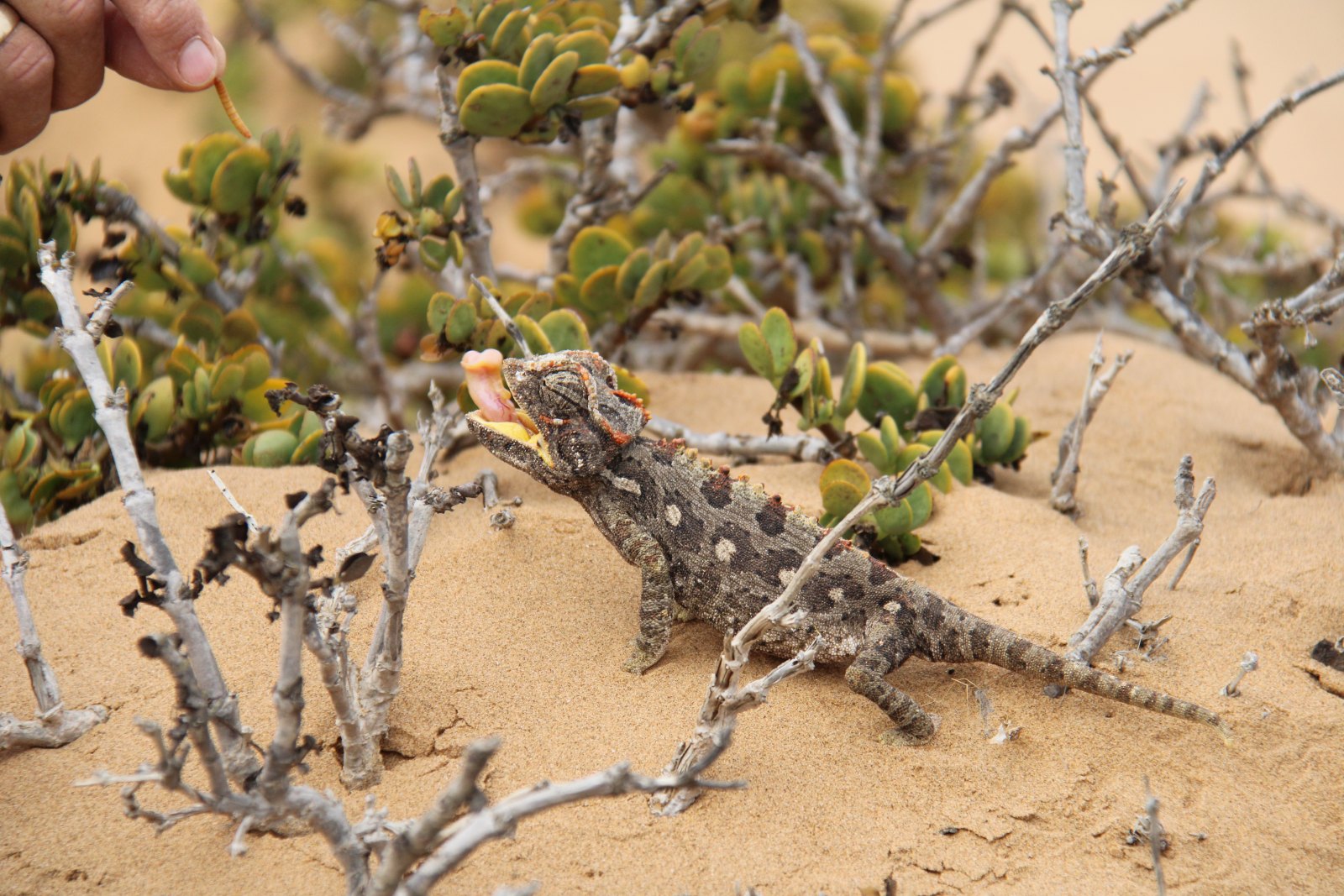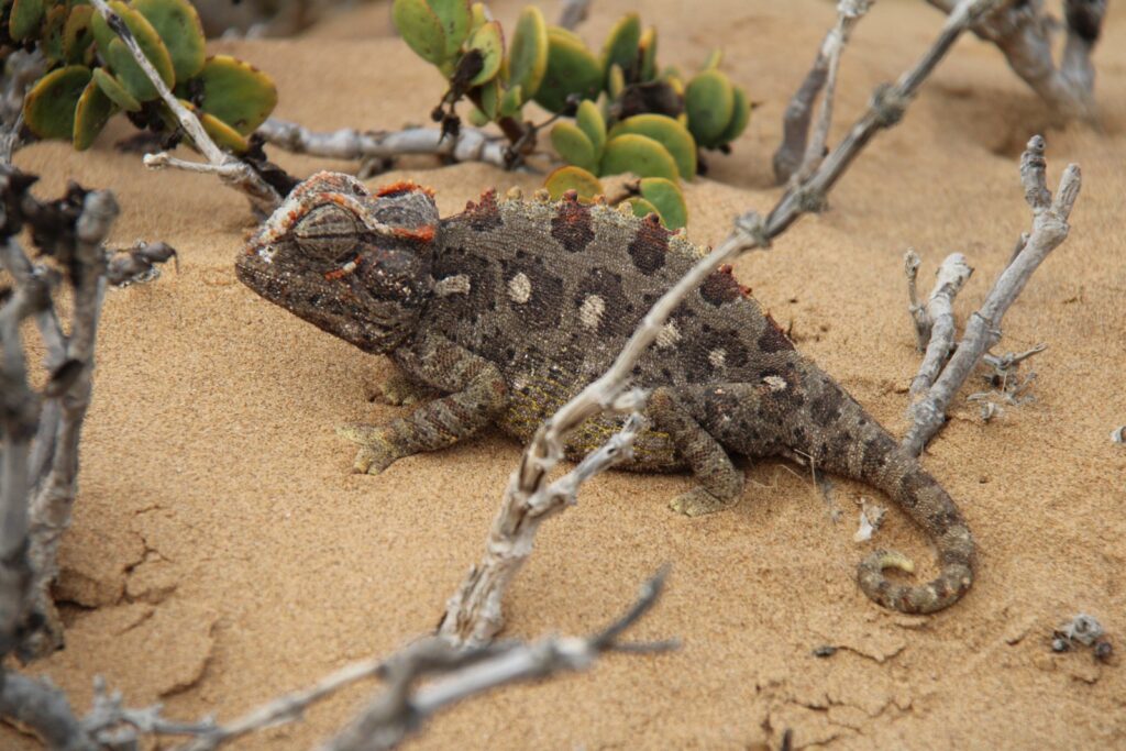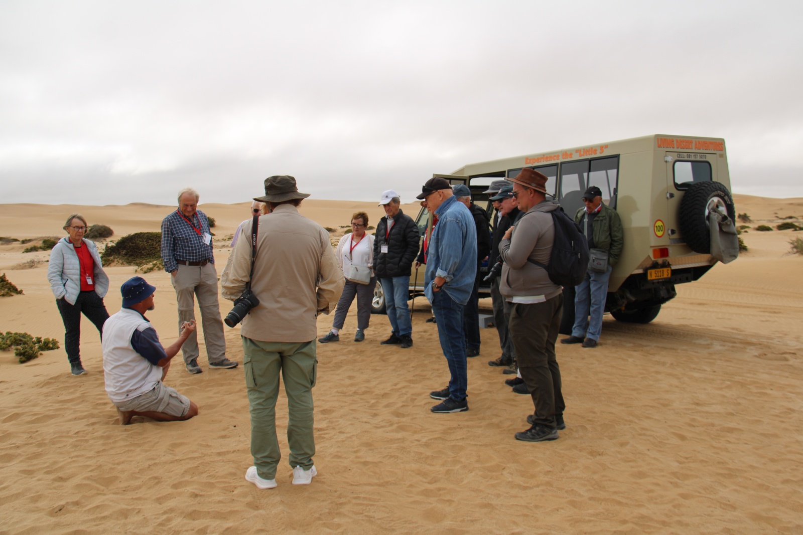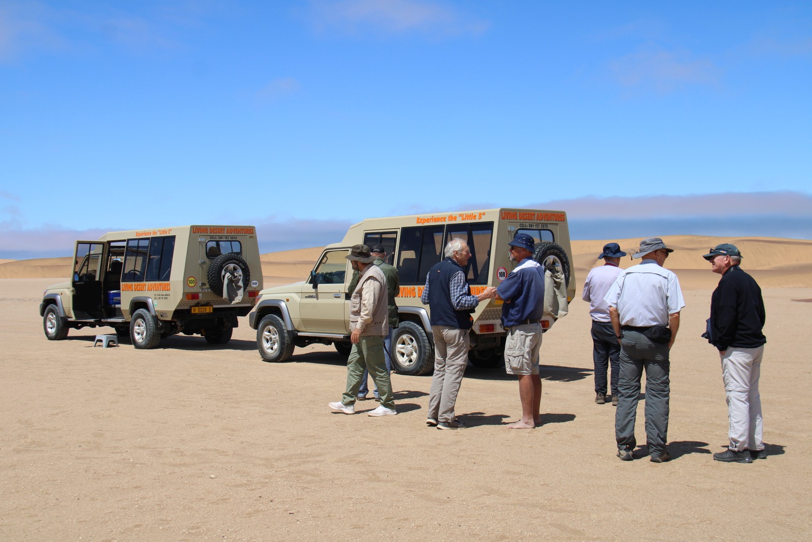 Jürgen, ein deutschstämmiger Namibier, der früher ein Restaurant führte und sein Hobby in der Naturbeobachtung fand, führt uns in den unmittelbar südlich der Stadt Swakopmund als Teil der Namibwüste gelegenen Nationalpark Dorob, um uns die «Little Five» näherzubringen. Es handelt sich dabei um den Namib Dünen Gecko, die Dünen-Ferrari Eidechse, das Namaqua Chamäleon, die Sandviper und die Tanzende Weisse Dame (als Dünen-Spinne), von denen er die ersten beiden sucht und aus dem Sand gräbt und den Dritten auf einer bewachsenen kleinen Kuppe findet. In blumigen Worten und mit viel Humor erklärt er uns eloquent ihre Überlebensweise und wir halten die kleinen Tiere zum Teil in eigenen Händen. Die wunderbare Dünenlandschaft in den verschiedensten Farbschattierungen basiert auf unterschiedlichsten Zusammensetzungen der Sande, die zum Teil sogar magnetische Eigenschaften aufweisen und so von den anderen abgetrennt werden können und unter Magneteinwirkung zu textilähnlichen Oberflächen zusammengefügt werden können. Am Ende werden wir mit den 4 × 4-Fahrzeugen über die recht hohen Dünen chauffiert. Wer im ursprünglichen Reiseprogramm den Besuch der weltweit höchsten Dünen in Sossusvlei vermisst hat, wird durch den Besuch der Dünen südlich von Swakopmund mit Jürgens Kommentaren mehr als entschädigt.