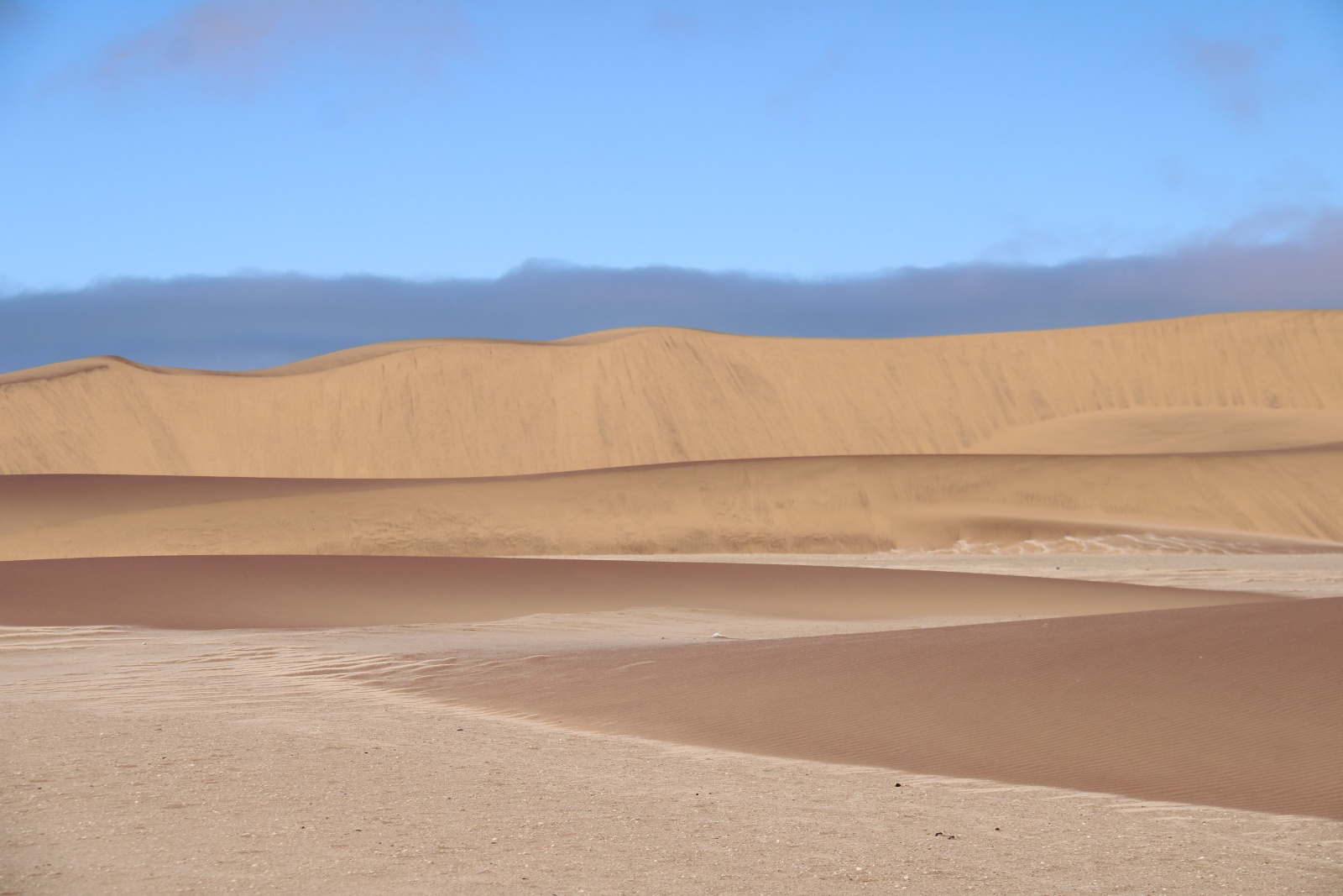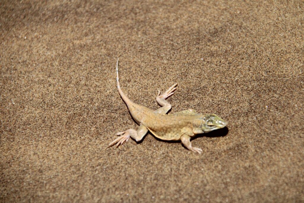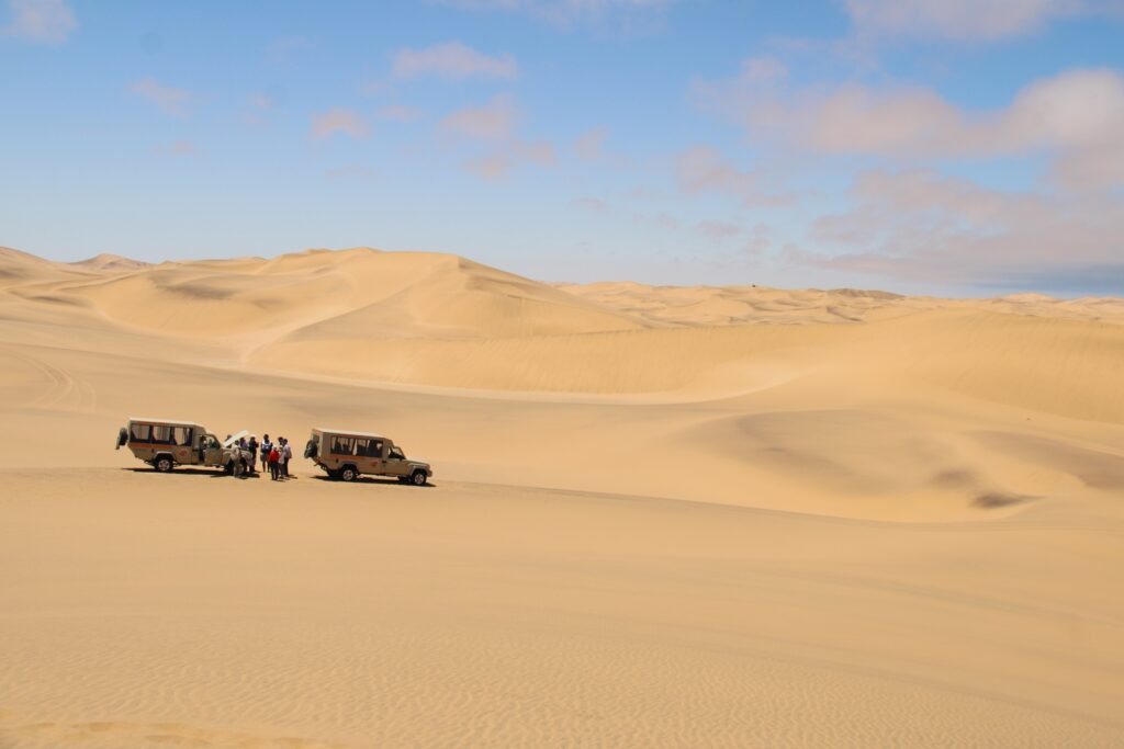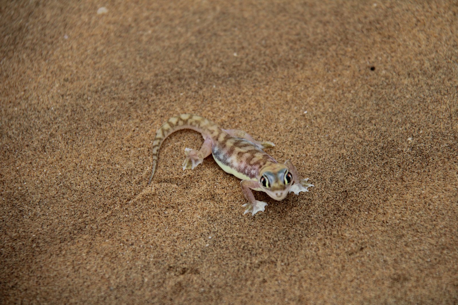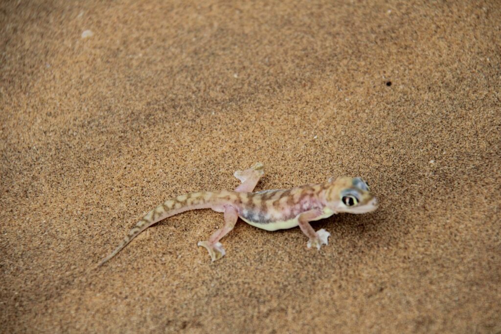 Jürgen, ein deutschstämmiger Namibier, der früher ein Restaurant führte und sein Hobby in der Naturbeobachtung fand, führt uns in den unmittelbar südlich der Stadt Swakopmund als Teil der Namibwüste gelegenen Nationalpark Dorob, um uns die «Little Five» näherzubringen. Es handelt sich dabei um den Namib Dünen Gecko, die Dünen-Ferrari Eidechse, das Namaqua Chamäleon, die Sandviper und die Tanzende Weisse Dame (als Dünen-Spinne), von denen er die ersten beiden sucht und aus dem Sand gräbt und den Dritten auf einer bewachsenen kleinen Kuppe findet. In blumigen Worten und mit viel Humor erklärt er uns eloquent ihre Überlebensweise und wir halten die kleinen Tiere zum Teil in eigenen Händen. Die wunderbare Dünenlandschaft in den verschiedensten Farbschattierungen basiert auf unterschiedlichsten Zusammensetzungen der Sande, die zum Teil sogar magnetische Eigenschaften aufweisen und so von den anderen abgetrennt werden können und unter Magneteinwirkung zu textilähnlichen Oberflächen zusammengefügt werden können. Am Ende werden wir mit den 4 × 4-Fahrzeugen über die recht hohen Dünen chauffiert. Wer im ursprünglichen Reiseprogramm den Besuch der weltweit höchsten Dünen in Sossusvlei vermisst hat, wird durch den Besuch der Dünen südlich von Swakopmund mit Jürgens Kommentaren mehr als entschädigt.
