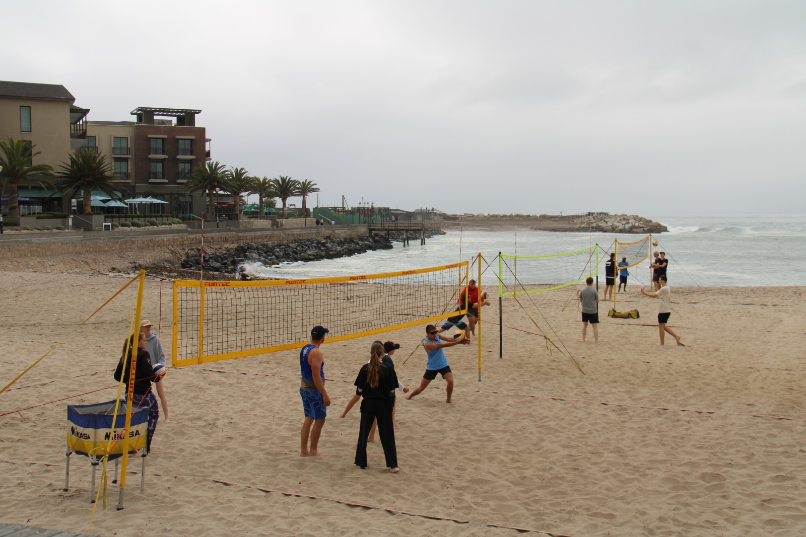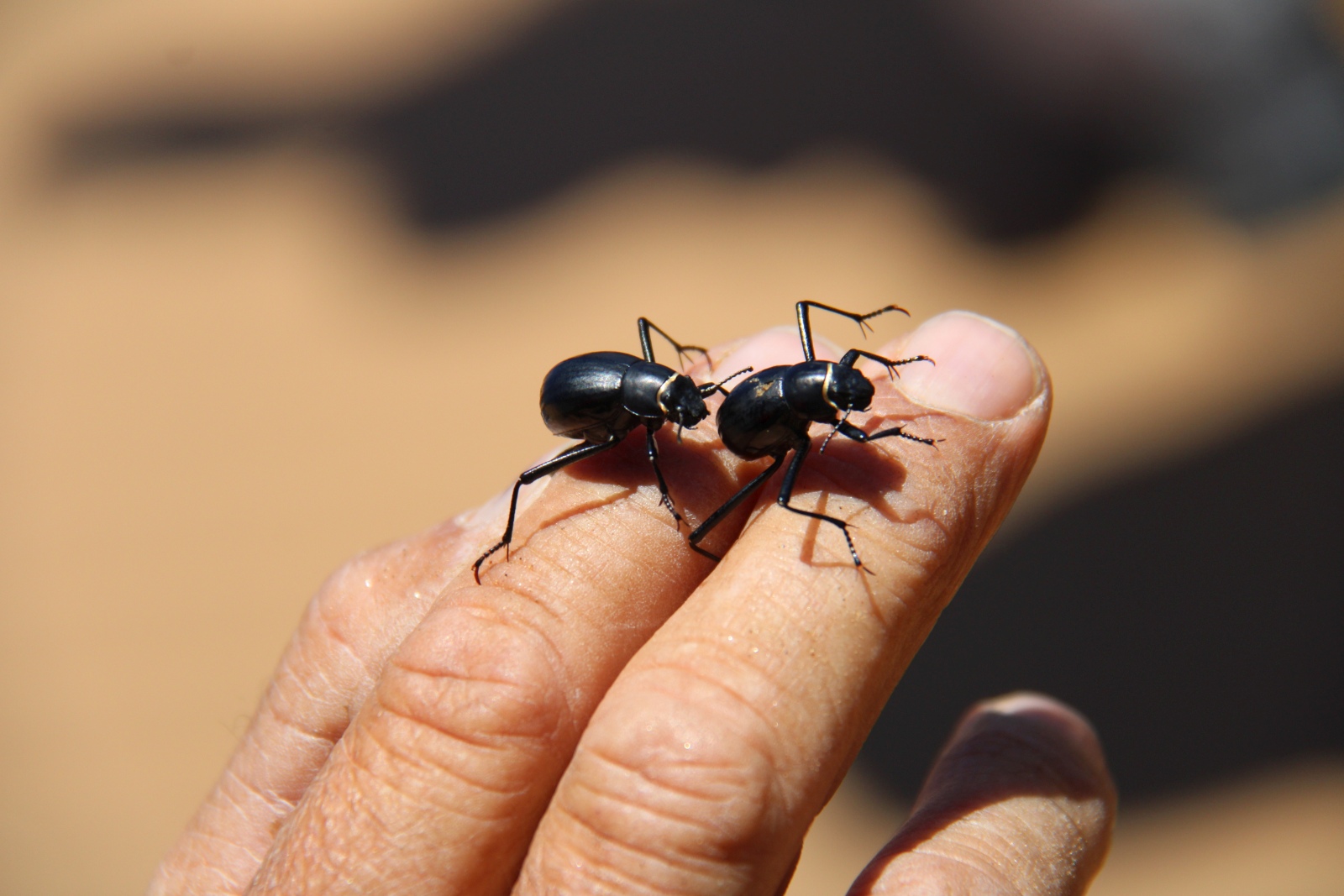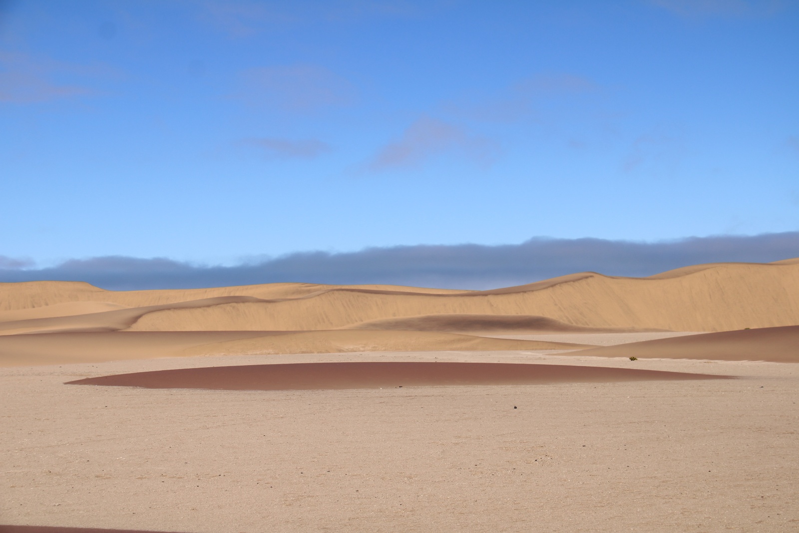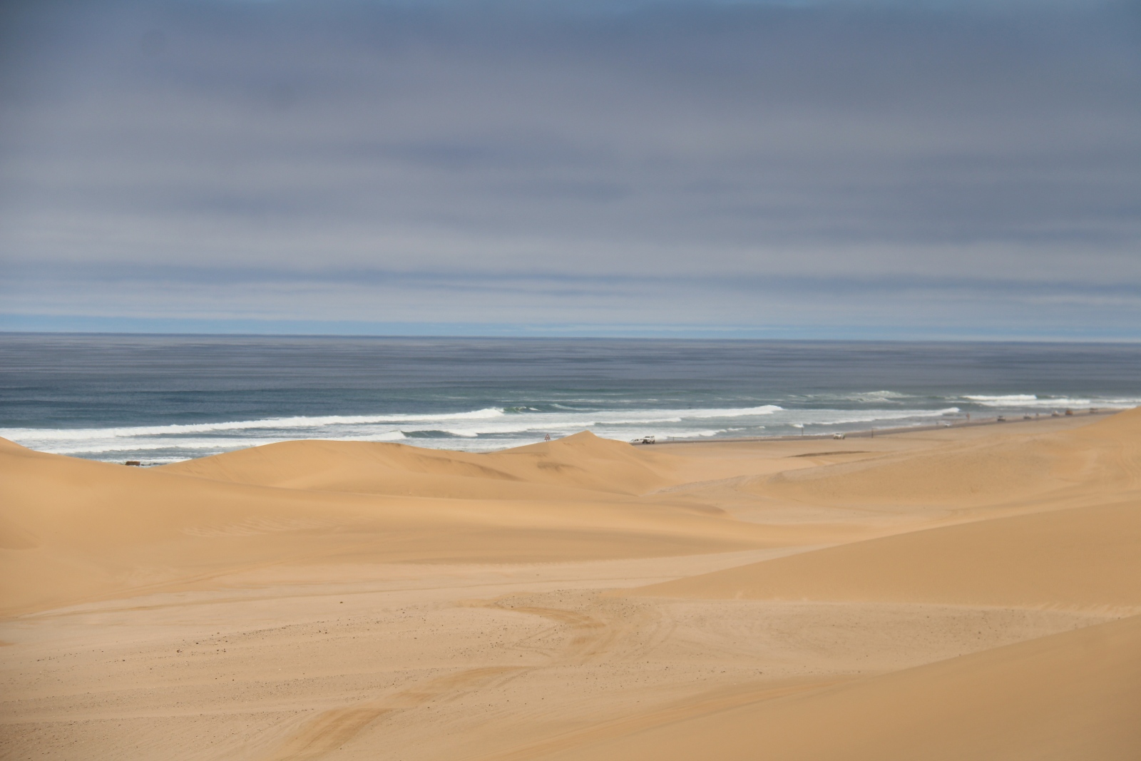 Jürgen, ein deutschstämmiger Namibier, der früher ein Restaurant führte und sein Hobby in der Naturbeobachtung fand, führt uns in den unmittelbar südlich der Stadt Swakopmund als Teil der Namibwüste gelegenen Nationalpark Dorob, um uns die «Little Five» näherzubringen. Es handelt sich dabei um den Namib Dünen Gecko, die Dünen-Ferrari Eidechse, das Namaqua Chamäleon, die Sandviper und die Tanzende Weisse Dame (als Dünen-Spinne), von denen er die ersten beiden sucht und aus dem Sand gräbt und den Dritten auf einer bewachsenen kleinen Kuppe findet. In blumigen Worten und mit viel Humor erklärt er uns eloquent ihre Überlebensweise und wir halten die kleinen Tiere zum Teil in eigenen Händen. Die wunderbare Dünenlandschaft in den verschiedensten Farbschattierungen basiert auf unterschiedlichsten Zusammensetzungen der Sande, die zum Teil sogar magnetische Eigenschaften aufweisen und so von den anderen abgetrennt werden können und unter Magneteinwirkung zu textilähnlichen Oberflächen zusammengefügt werden können. Am Ende werden wir mit den 4 × 4-Fahrzeugen über die recht hohen Dünen chauffiert. Wer im ursprünglichen Reiseprogramm den Besuch der weltweit höchsten Dünen in Sossusvlei vermisst hat, wird durch den Besuch der Dünen südlich von Swakopmund mit Jürgens Kommentaren mehr als entschädigt.