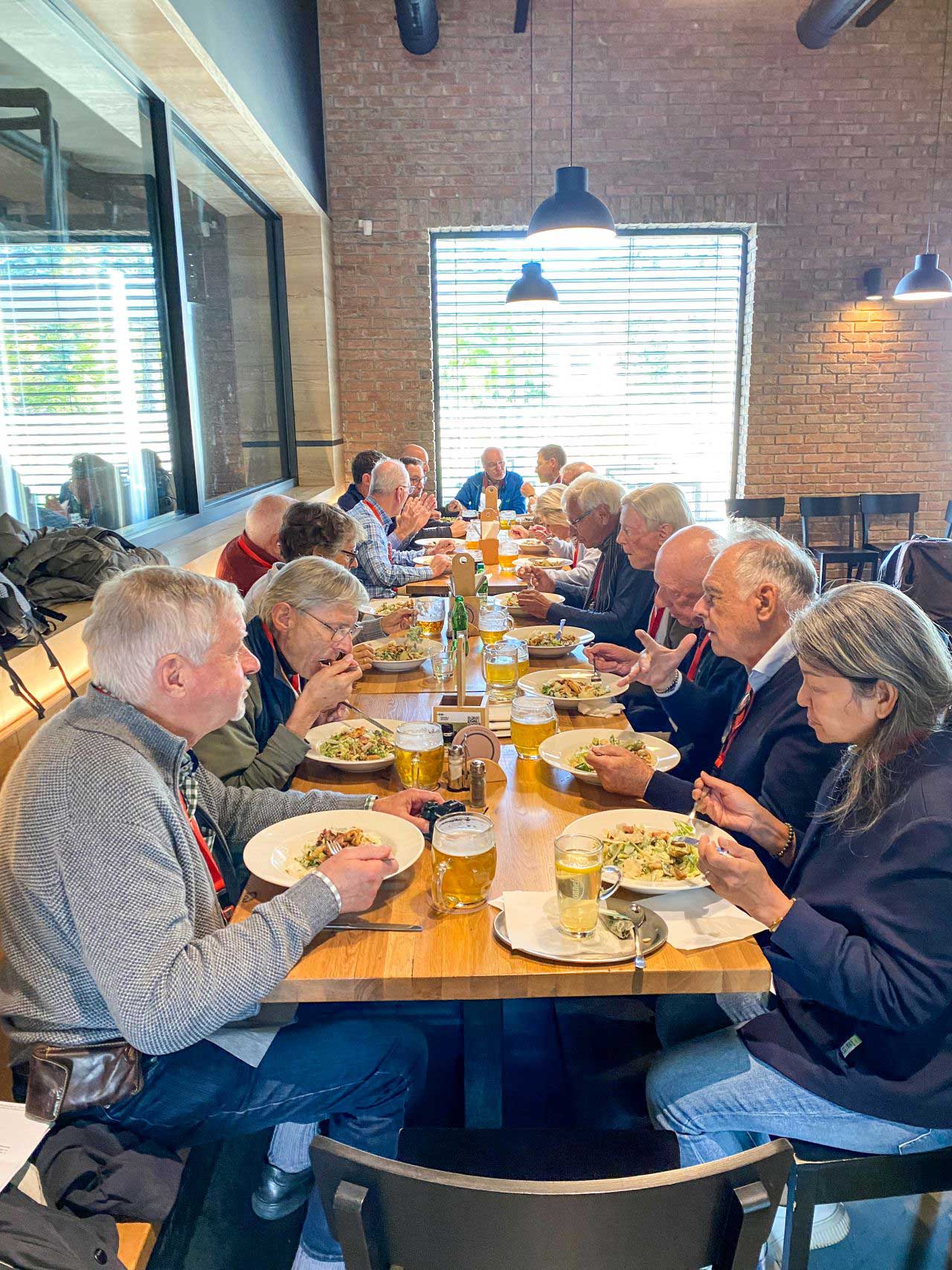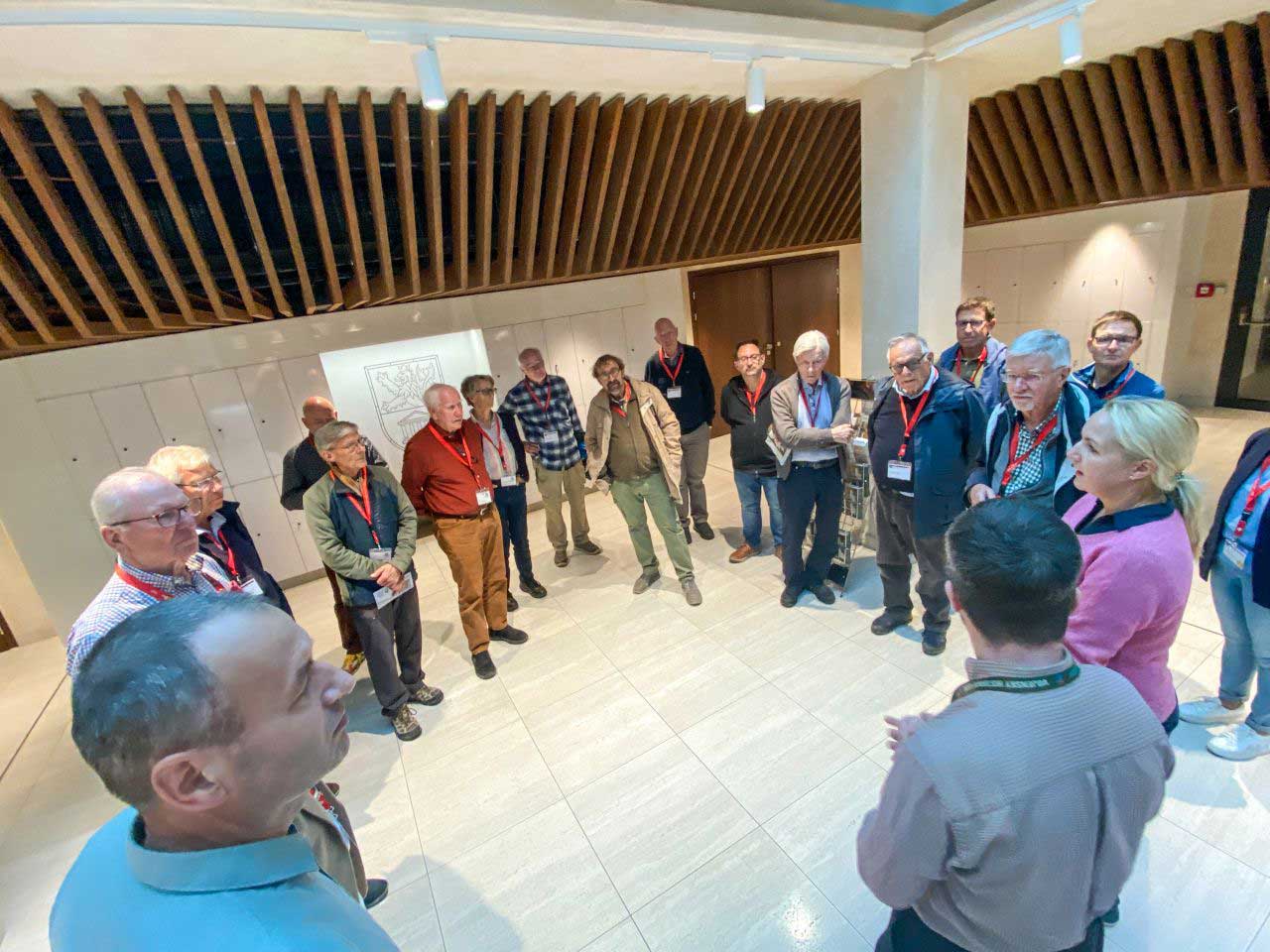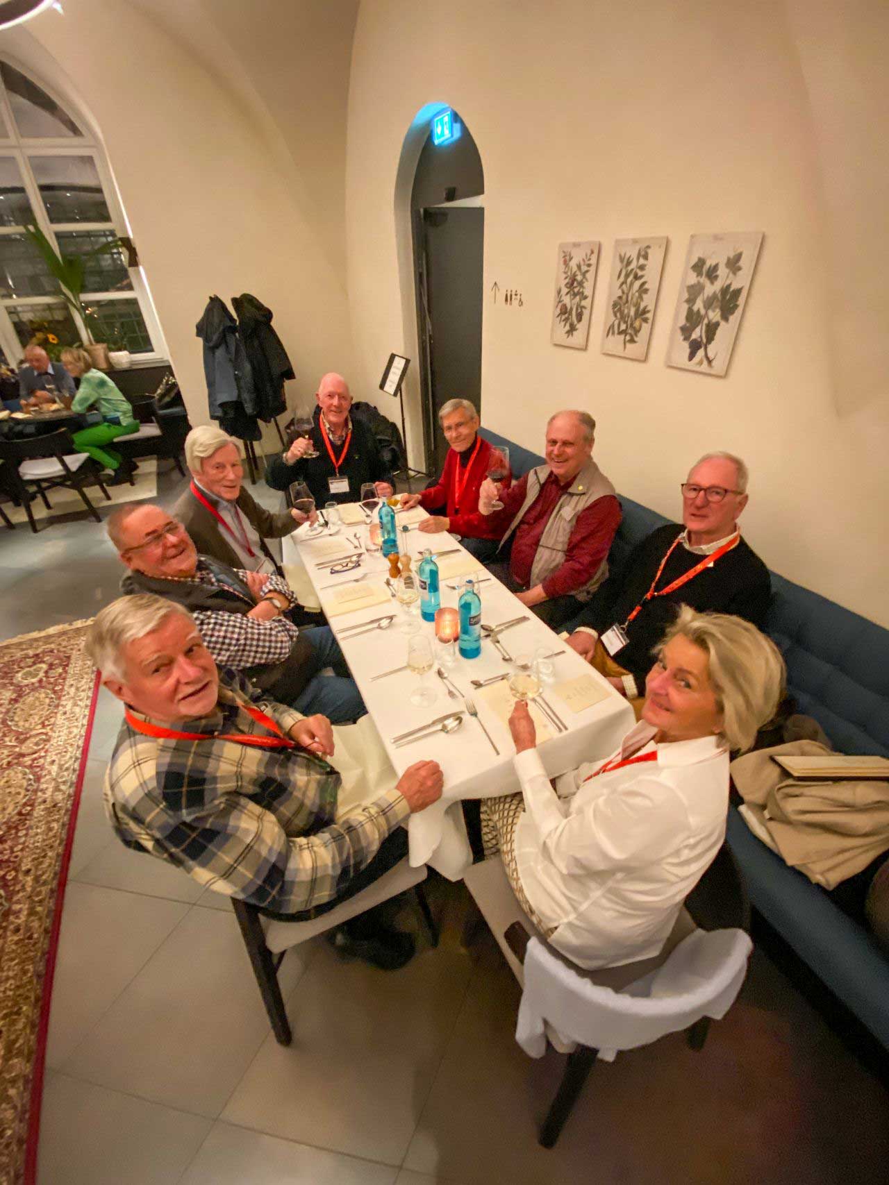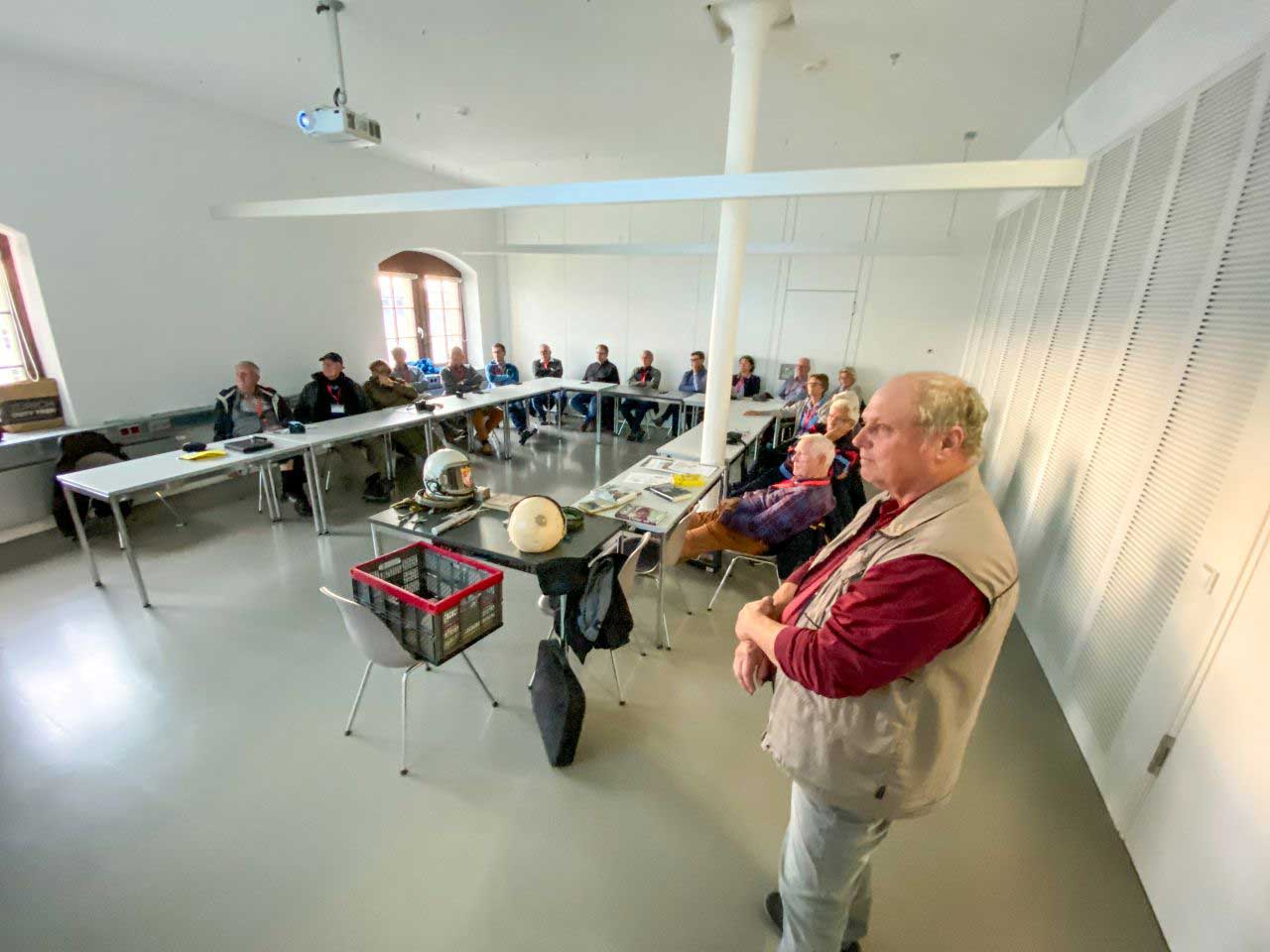 Im Restaurant Runway 34 in Kloten sorgte im Hintergrund eine Iljushin 14 für das passende Ambiente zum ersten Referat dieser Reise von Oberstleutnant a.D. René Zürcher. Er war während des kalten Kriegs Nachrichtenoffizier der Schweizer Luftwaffe und erzählte uns von seinen persönlichen Beobachtungen. So werde bis heute von den Russen der Luftkampf vom Boden aus geführt und die Eigenkompetenz eines Piloten sei damit an einem kleinen Ort. Das gehe hin bis zu den Schiessbefehlen. Während des Kalten Krieges sei auch über die Anzahl und Typen der Flugzeuge und über deren Standorte in Moskau entschieden worden und nicht in den jeweiligen WAPA-Staaten. Die Fragen der Reiseteilnehmer wurden vom Referenten kompetent beantwortet.