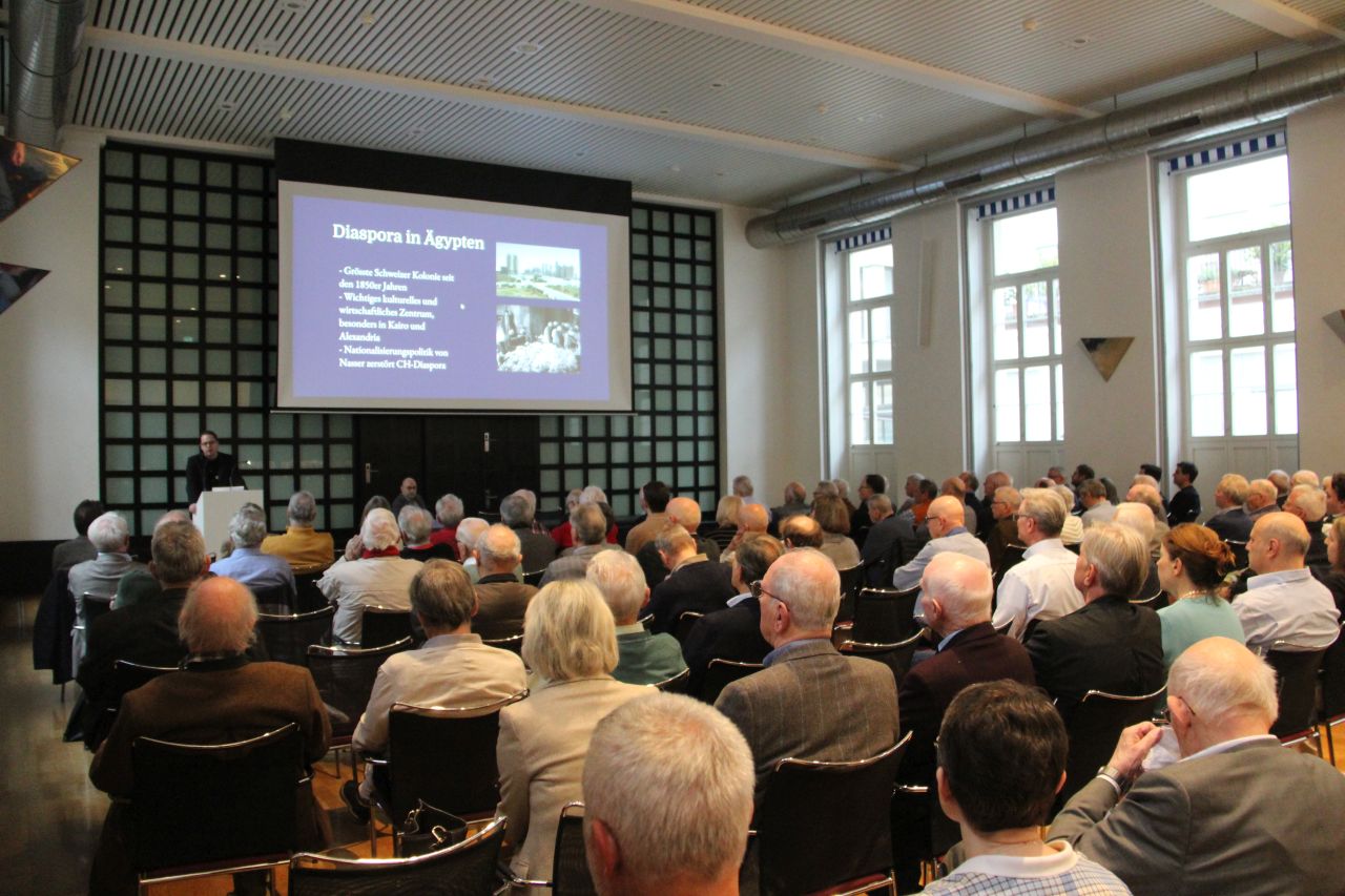 Historiker Daniel Rickenbacher erläuterte einleitend die politischen Interessen der Schweiz in den ersten beiden Jahrzehnten nach dem Zweiten Weltkrieg. Bis in die 1960-er Jahre des 20. Jahrhunderts war die wichtigste Auslandschweizergemeinde in Ägypten. Rund 1000 in der Regel begüterte Schweizerinnen und Schweizer widmeten sich dem Baumwollhandel und anderen Geschäften. Mit Machtübernahme Nassers Ende der 60-er Jahre und seiner Nationalisierungspolitik Ägyptens wurde diese Gemeinschaft zur Auswanderung gezwungen. Heute lebt die grösste Schweizer-Kolonie des Nahen Ostens und Asiens in Israel. Sie zählte 2022 rund 24‘000 Personen. Diese Gemeinschaft wird bei einem Handelsvolumen von rund 1,8 Mia. Franken an Bedeutung gewinnen. Die zweitwichtigste Auslandschweizer-Gemeinschaft findet sich in den Vereinigten Arabischen Emiraten bei einem Handelsvolumen von 18,7 Mia. Franken (2022). Sie ist vor allem wirtschaftlich getrieben. In Saudi-Arabien leben rund 400 Auslandschweizer bei einem Handelsvolumen von rund 2,3 Mia. Franken. Heute liegen die Schweizer Interessen primär in Israel.